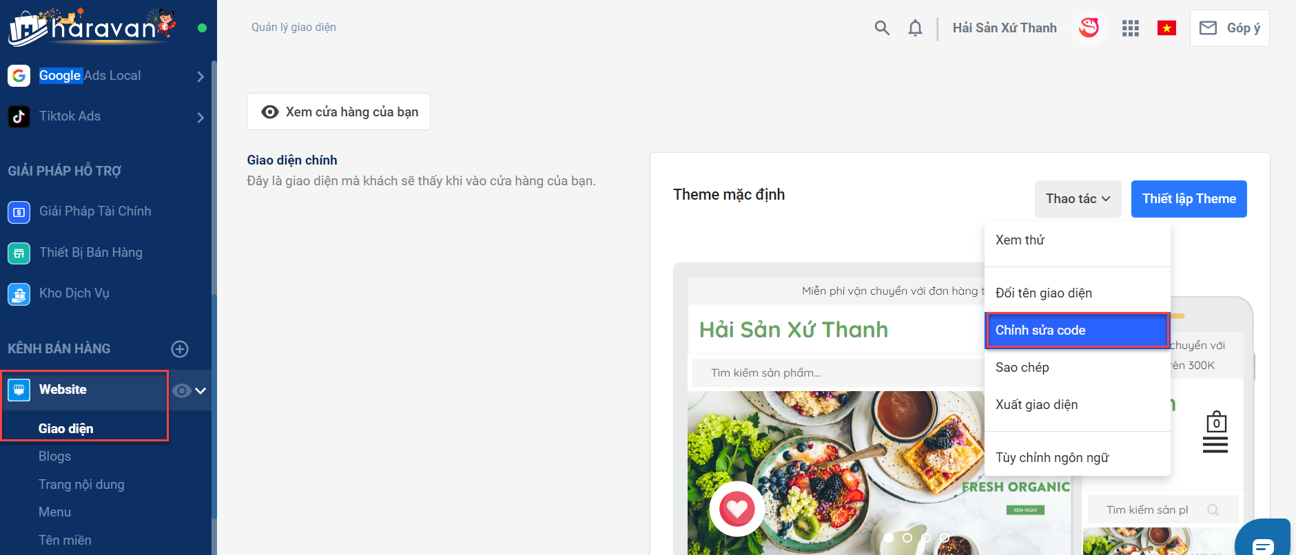 - Sau đó bạn vào mục “Website” >> chọn “Thao tác" >> "Chỉnh sửa code"