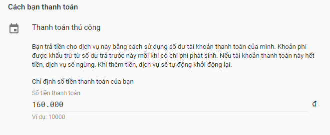 Lưu ý: Số tiền tối thiểu bạn phải nạp vào tài khoản Google Ads là 160.000VNĐ.