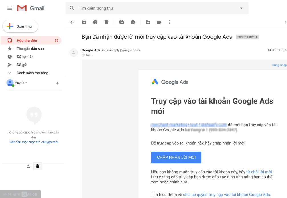 *Trong trường hợp không nhận được email thông báo, bạn có thể tìm theo tiêu đề "Bạn đã nhận được lời mời truy cập vào tài khoản Google Ads" (hoặc bằng tiếng Anh với tiêu đề "You received an invitation to access a Google Ads account").