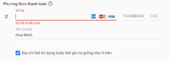 Với thị trường Việt Nam, Google hỗ trợ các loại thẻ có chức năng thanh toán quốc tế như Visa, Mastercard,...