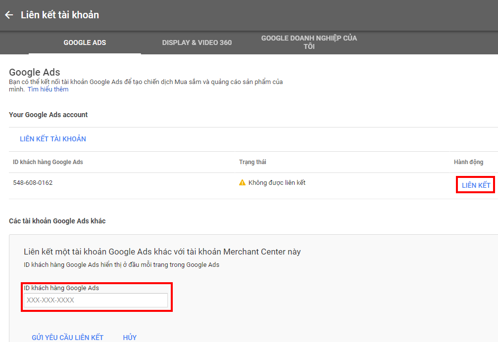 Sau đó bạn được dẫn tới giao diện "Liên kết tài khỏa" ở đây bạn có thể liên kết chung một tài khoản ở trên Google Ads và Merchant Center hoặc bạn có thể liên kết với tài khoản Google Ads khác bằng cách nhập ID vào ô màu đỏ như hình sau: