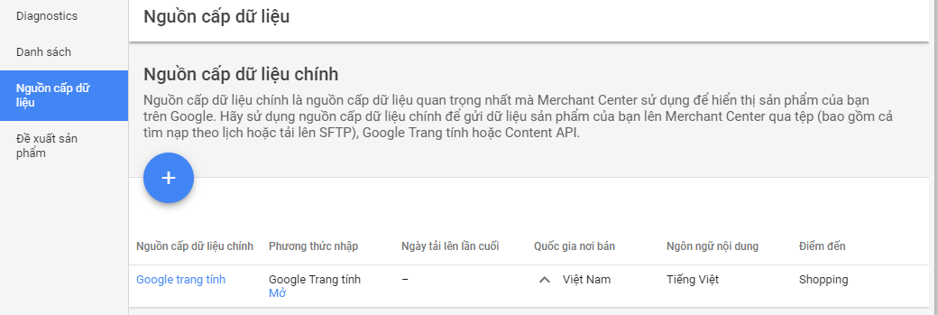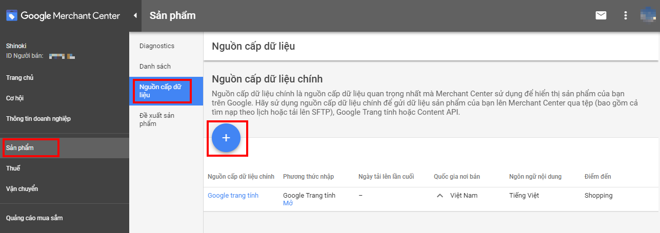 Bước 03: Sau khi đã xác thực URL xong, để có thể đồng bộ thông tin sản phẩm bạn cần vào mục "Sản phẩm" chọn tiếp "Nguồn cấp dữ liệu" và nhấp vào dấu cộng (+) như sau: