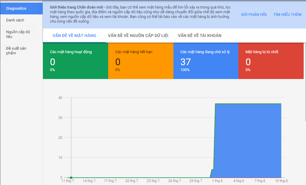 Bước 10: Trong lần nạp đầu tiên, Google sẽ xem xét sản phẩm và website của bạn có vi phạm nào về chính sách bảo vệ người dùng của Google hay không. Và thời gian để kiểm tra có thể mất từ 02-03 ngày làm việc. Bạn có thể theo dõi tình trạng sản phẩm của mình thông qua mục "Chẩn đoán - diagnostics" tại trang sản phẩm, nếu có vấn đề gì về sản phẩm hay tài khoản bạn sẽ được thông báo qua giao diện này.