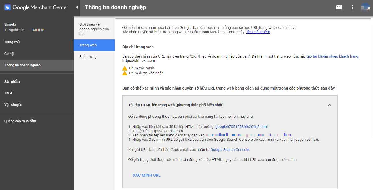 Bước 02**:**Xác thực URL website của bạn bằng cách cung cấp thông tin vào mục "Giới thiệu về danh nghiệp của bạn" và làm theo hướng dẫn ở mục "Trang web" như hình ảnh dưới đây.