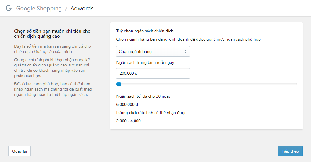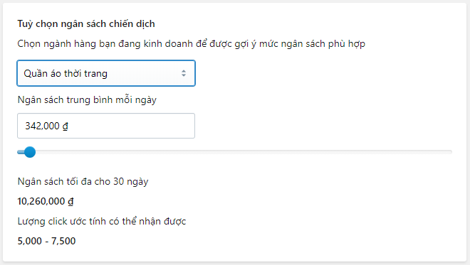 Tiếp theo hệ thống sẽ cho phép bạn thiếp lập ngân sách cho chiến dịch quảng cáo của mình cho 30 ngày. Khi lựa chọn ngành hàng mà bạn đang kinh doanh tương ứng trong menu "Chọn ngành hàng", hệ thống sẽ gợi ý mức ngân sách trung bình mỗi ngày và tương ứng với mức ngân sách đó chiến dịch sẽ nhận được kết quả là số nhấp chuột được ước tính ở mục cuối cùng.