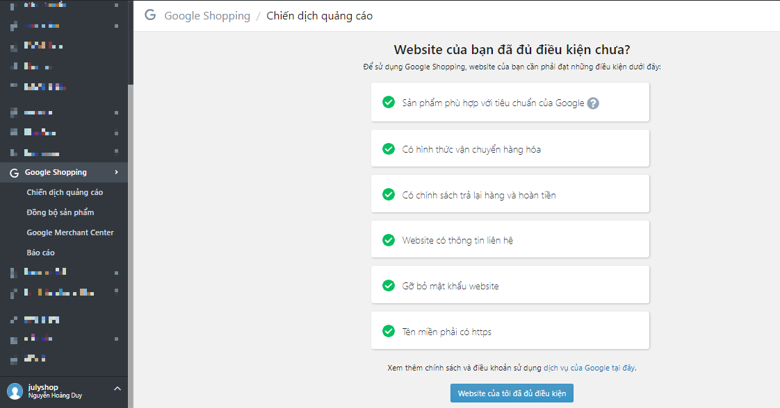Khi website của bạn đã đủ điều kiện (dấu tick xanh) thì nhấp "Website của tôi đủ điều kiện" để thao tác các bước tiếp theo.