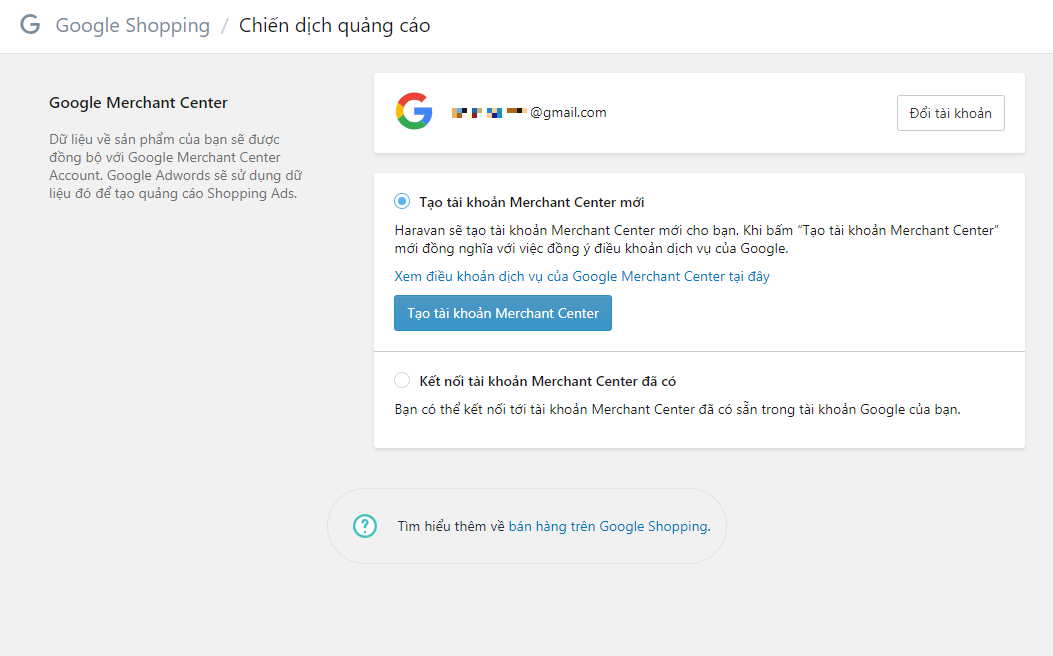 Tiếp theo, bạn cần kết nối hoặc tạo mới tài khoản Google Merchant Center.