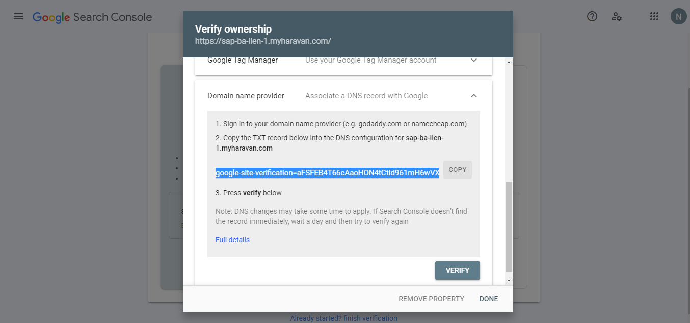 - **Bước 5:**Sau đó, bạn cần xác minh quyền sở hữu của tên miền này bằng cách copy đoạn mã sau vào cấu hình DNS cho tên miền của bạn. Chọn Done