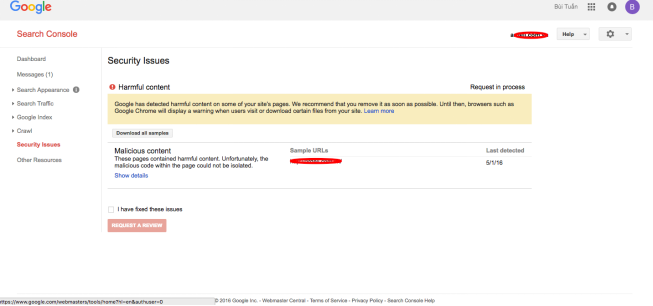 - **Bước 7:**Tick chọn “I have fixed these issuses” và Chờ email phản hồi