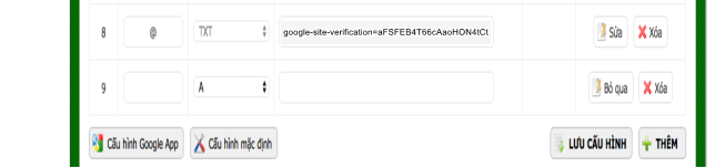 - **Bước 6:**Đăng nhập quản lý tên miền và Trỏ thêm Record TXT như hình → Lưu cấu hình