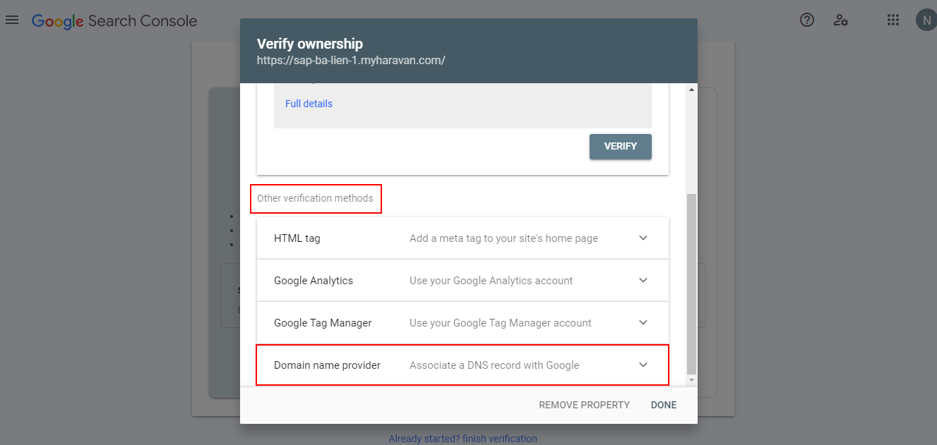 - Bước 4: Hệ thống sẽ hiển thị pop up Verify Ownership. Nhà bán hàng kéo xuống dưới mục Other verification methods và chọn vào mục Domain name provider