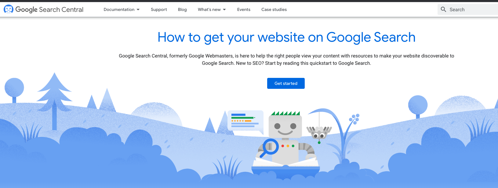 - Bước 1: Truy cập vào địa chỉ https://www.google.com/webmasters/ (https://developers.google.com/search) → Click Get Started(Dùng Tài khoản gmail để đăng nhập).