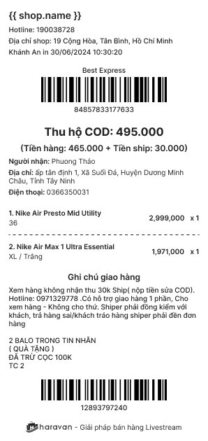 Đây là phiếu in sau khi bạn in hoàn tất, bạn có thể dán trực tiếp vài đơn hàng mà bạn muốn gửi cho khách.