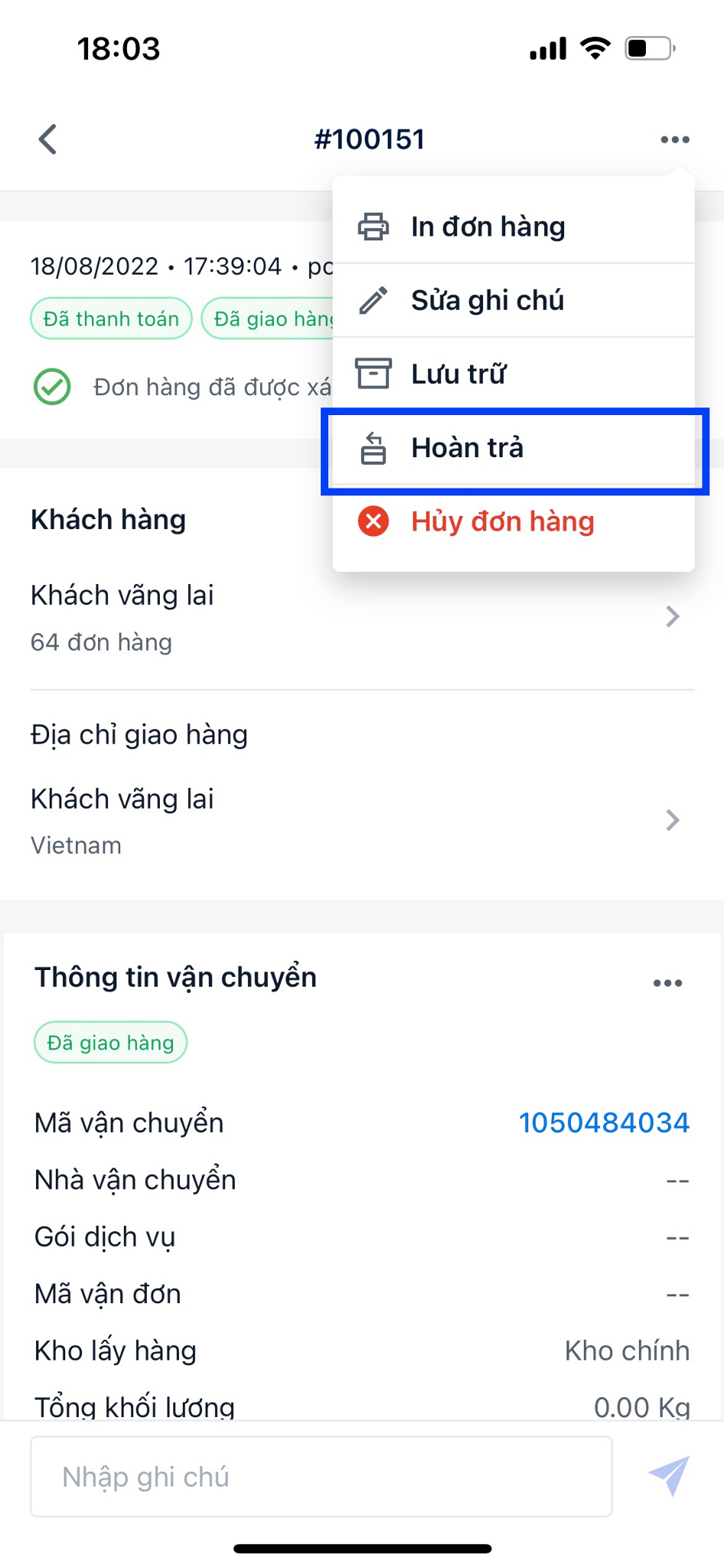 Nhà bán hàng có thể thực hiện hoàn trả đơn hàng trên ứng dụng khi có đơn hàng bị khách hoàn trả lại