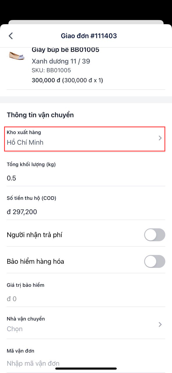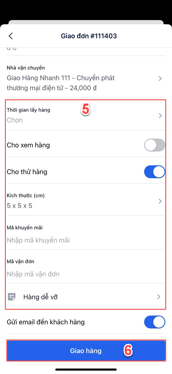 Thực hiện nhập thông tin vận chuyển (tùy theo nhà vận chuyển sẽ có các thông tin khác nhau)