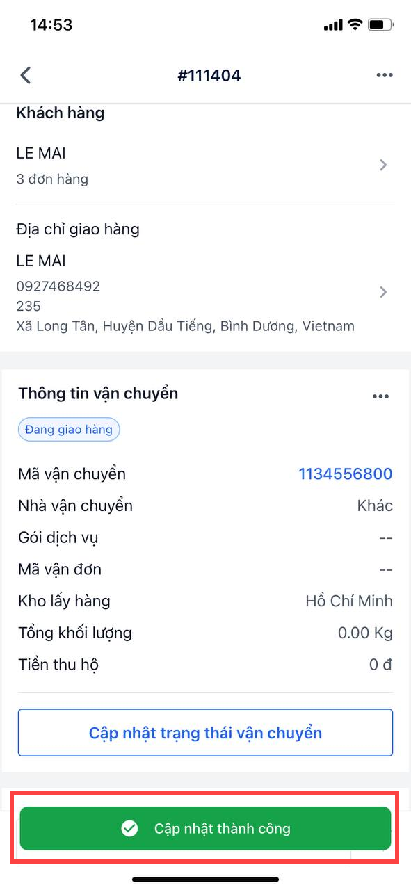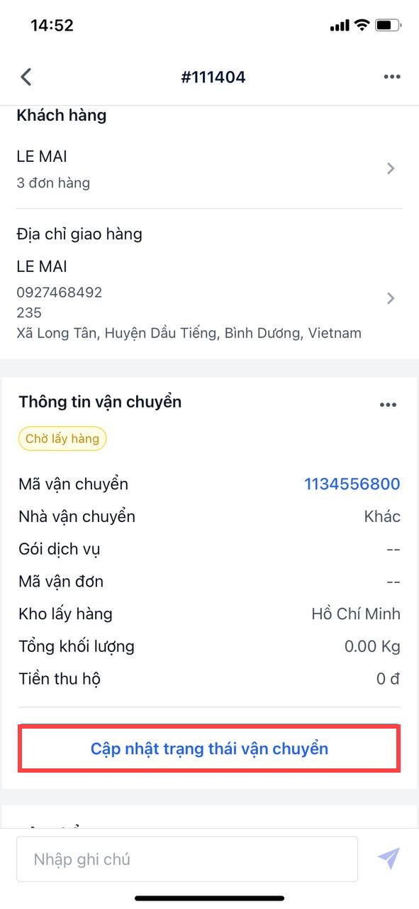 Để thực hiện cập nhật trạng thái vận chuyển, bạn thực hiện: