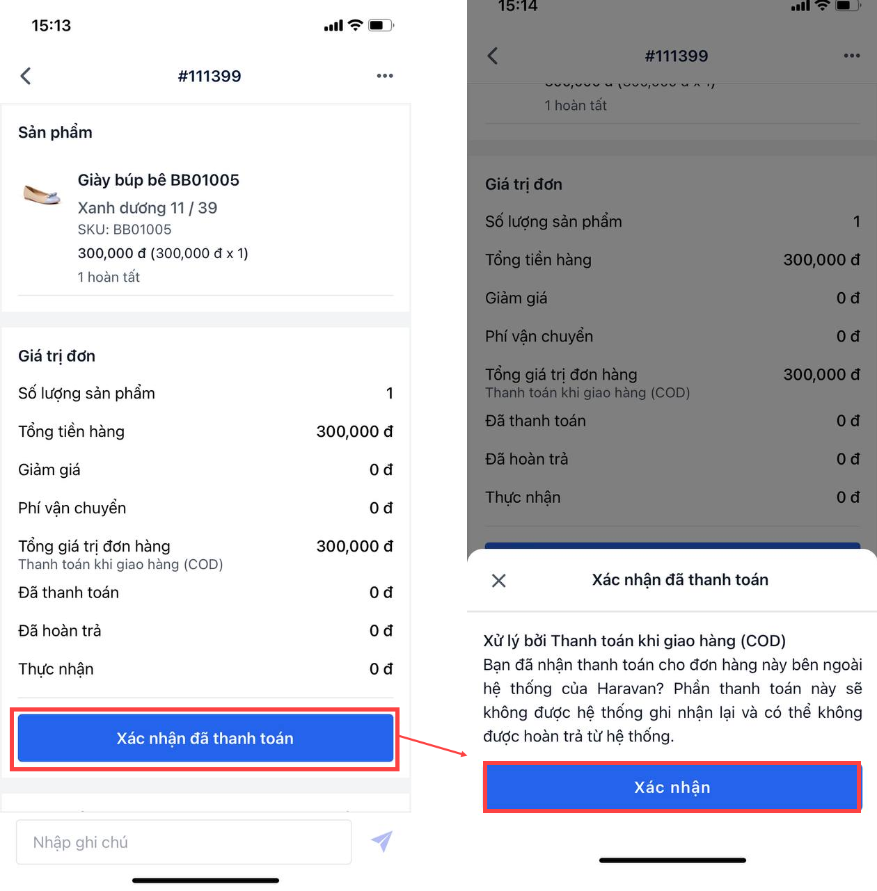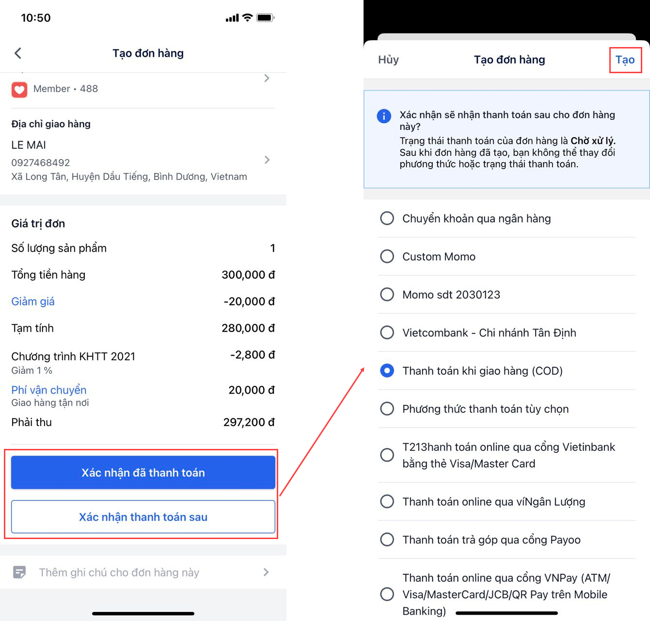 Chọn Xác nhận đã thanh toán *(đơn sẽ không thu COD)*và Xác nhận thanh toán sau (đơn sẽ thu COD)