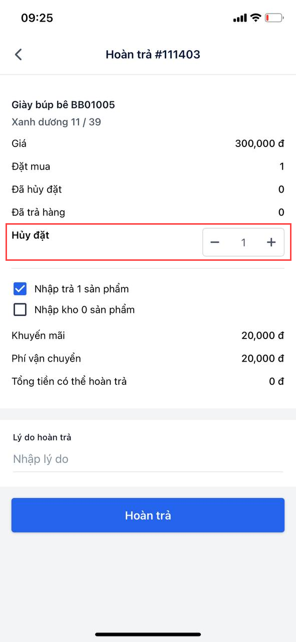 Với đơn hàng chưa thanh toán và chưa xử lý giao hàng, nhà bán hàng thực hiện nhập số sản phẩm trả hàng