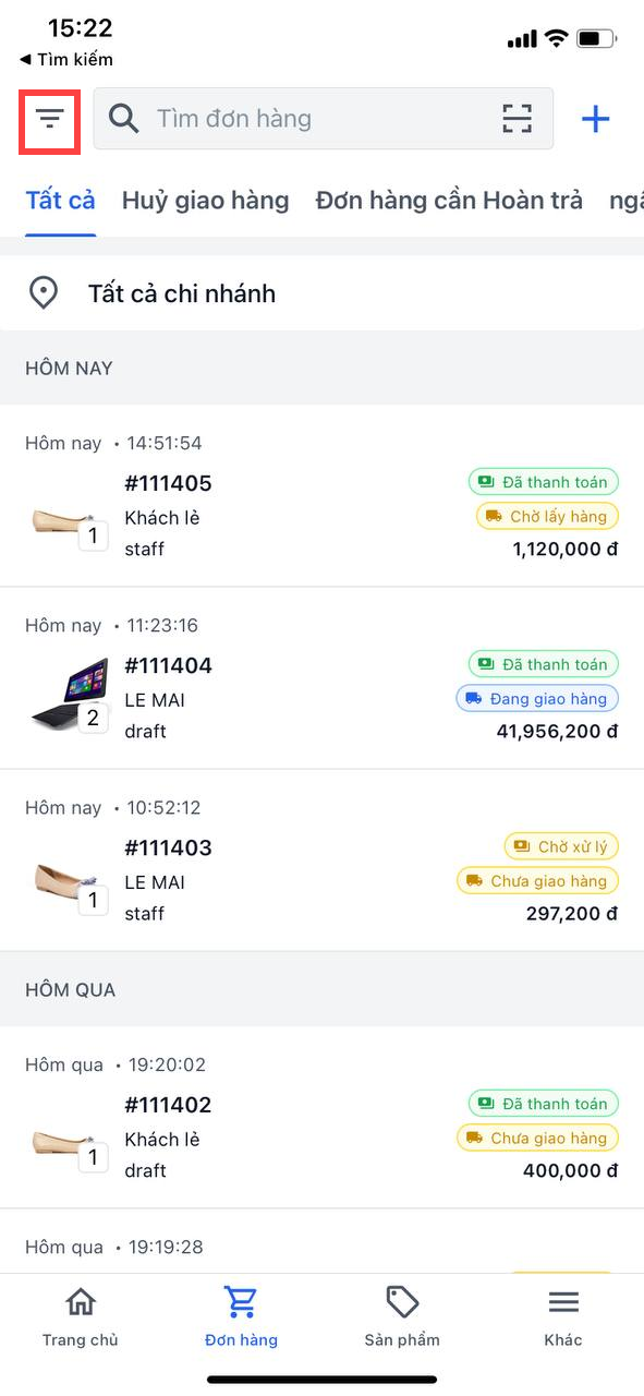 Bên cạnh đó, bạn có thể sử dụng bộ lọc để lọc đơn hàng theo các điều kiện một cách nhanh chóng. Để lọc đơn hàng, bạn thực hiện