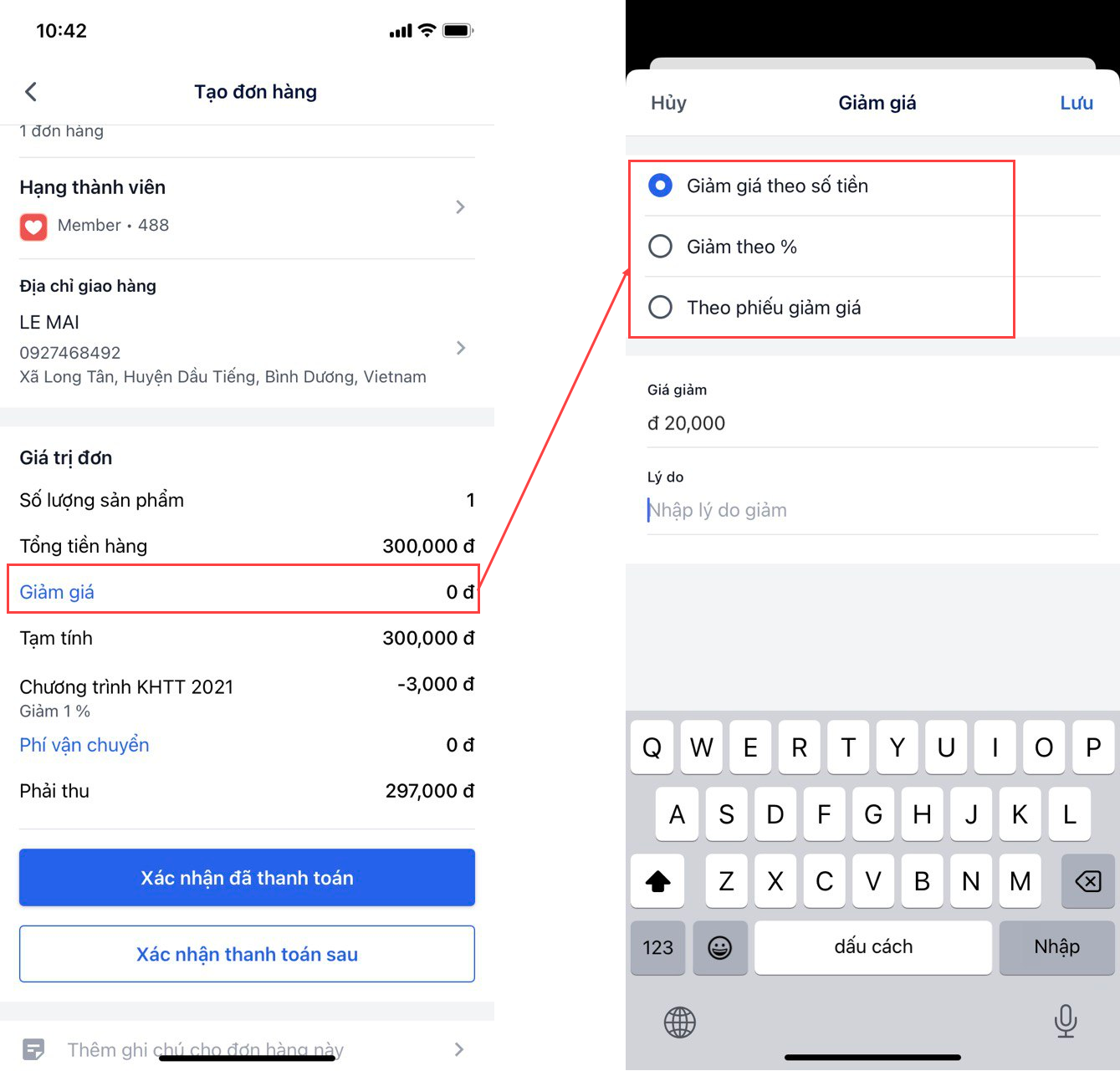 - Thực hiện thêm **Giảm giá (nếu có)**cho đơn hàng