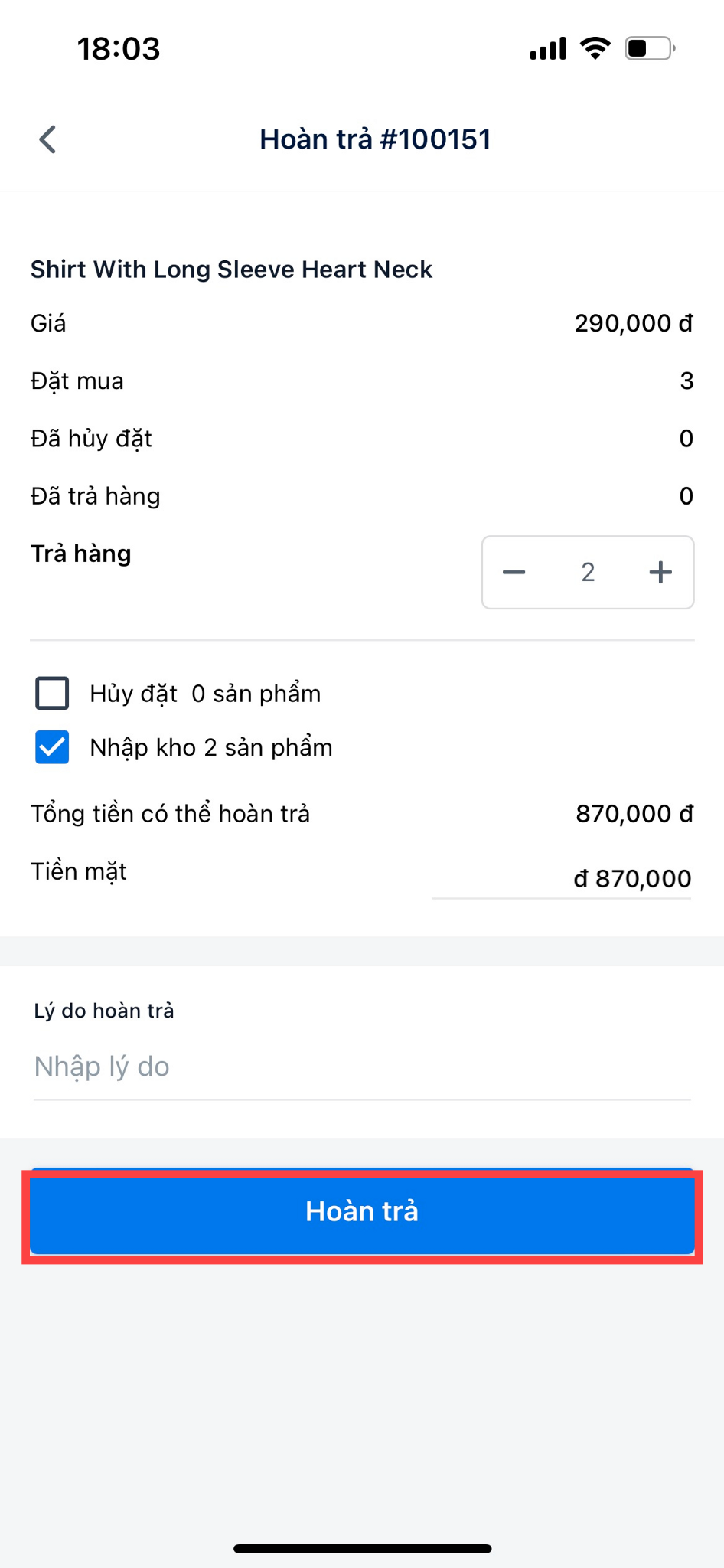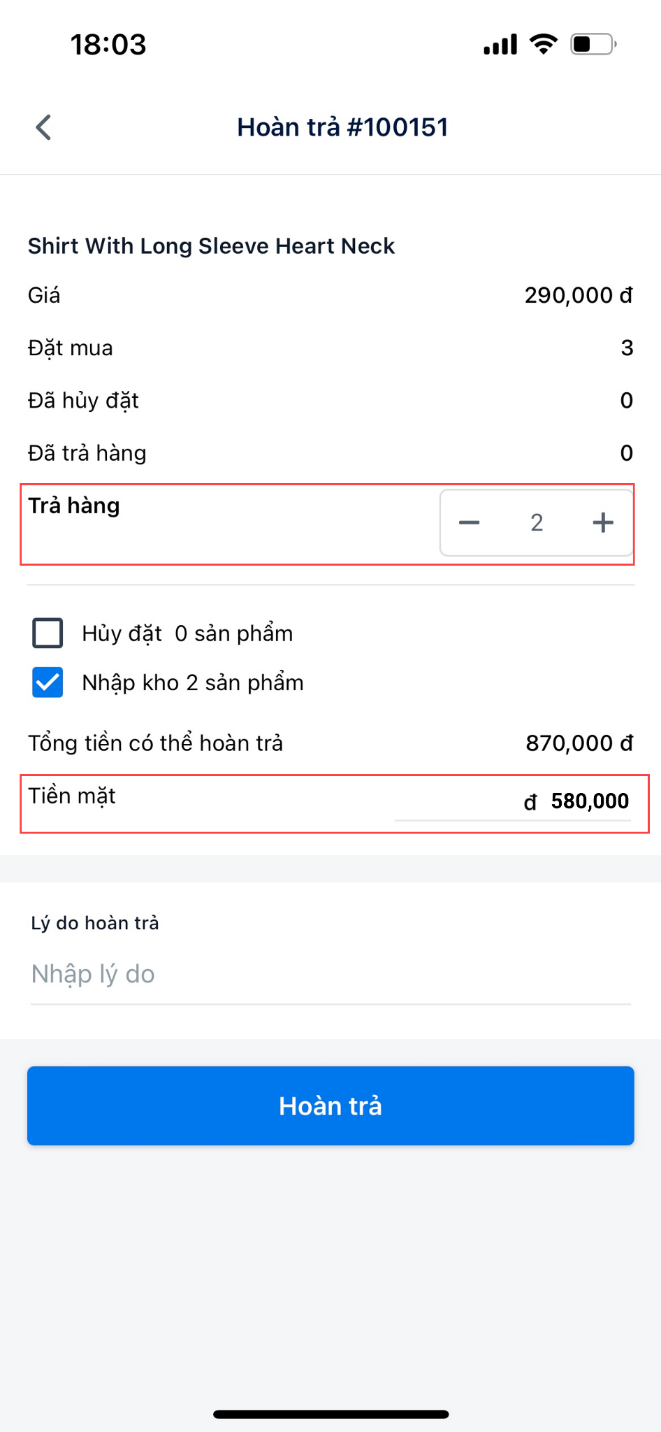 Ví dụ người mua hoàn trả 2 sản phẩm trên đơn, mỗi sản phẩm giá 290.000 VNĐ, nhà bán hàng sẽ nhập 580.000 VNĐ vào mục tiền mặt