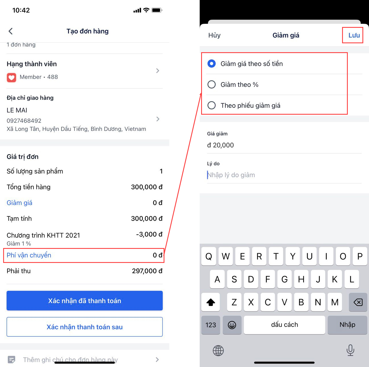 - Giảm giá theo số tiền và theo % chỉ áp dụng cho đơn hàng đang tạo