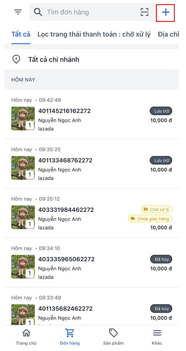 - Tại màn hình Đơn hàng, bạn chọn biểu tượng +