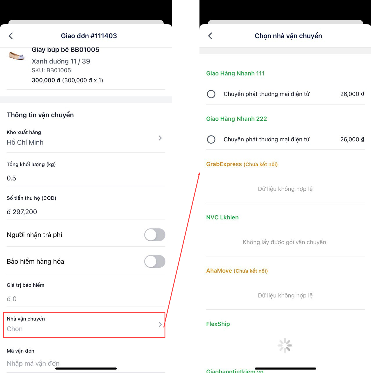 - Phí vận chuyển Tùy chỉnh: Nhà vận chuyển tự thêm mức phí vận chuyển áp dụng cho đơn hàng đang tạo