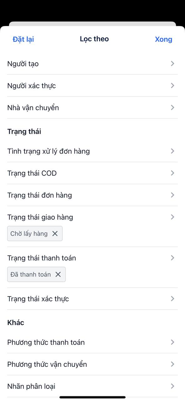 - Thiết lập các điều kiện đơn hàng -> chọn Xong để tạo bộ lọc