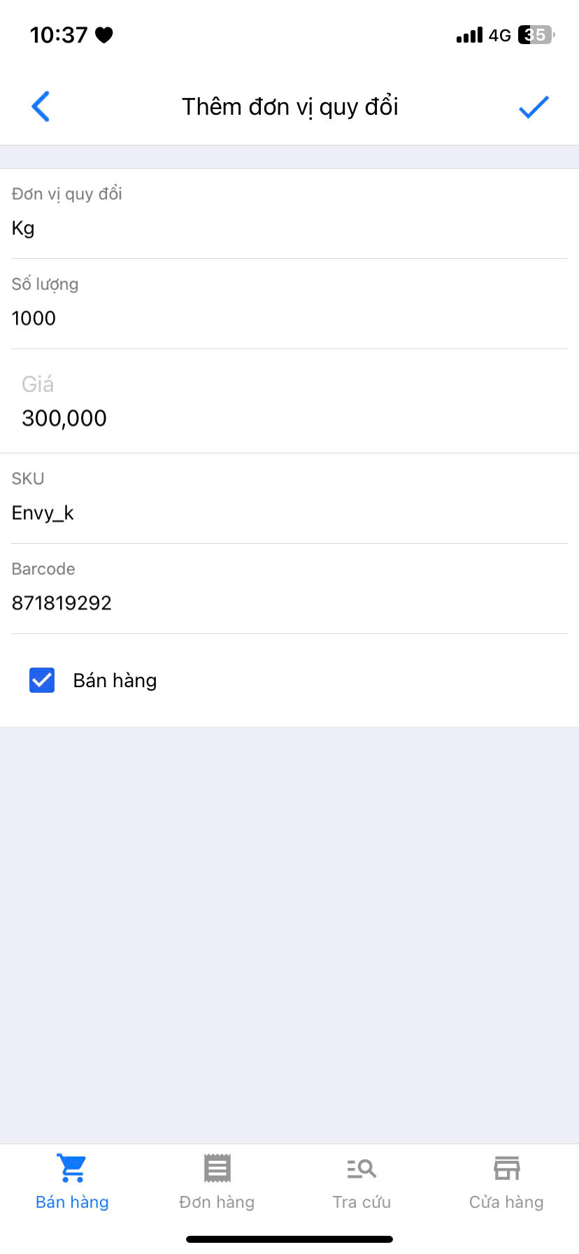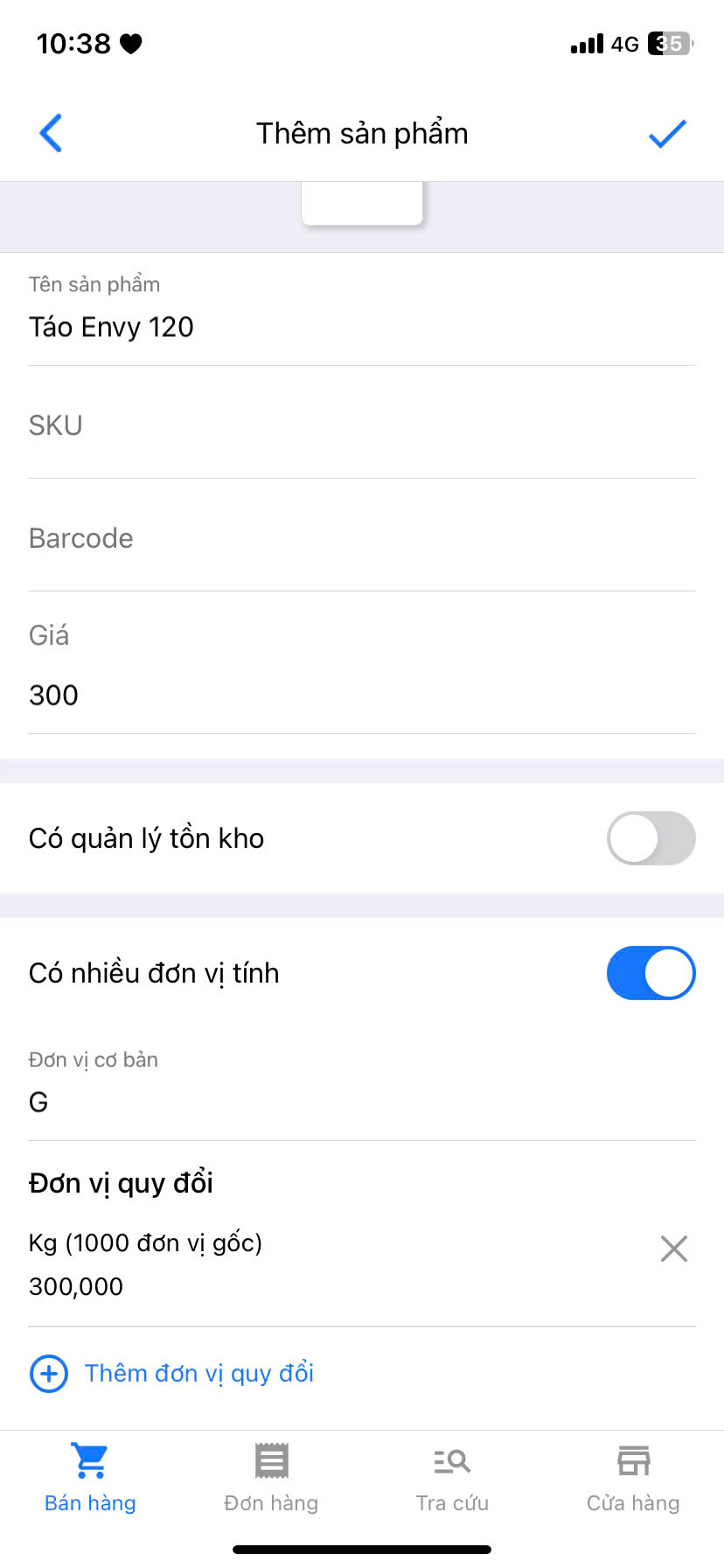 - Thông tin các đơn vị quy đổi sẽ được hiển thị trong trang tạo sản phẩm -> Chọn biểu tượng ✓ để hoàn tất