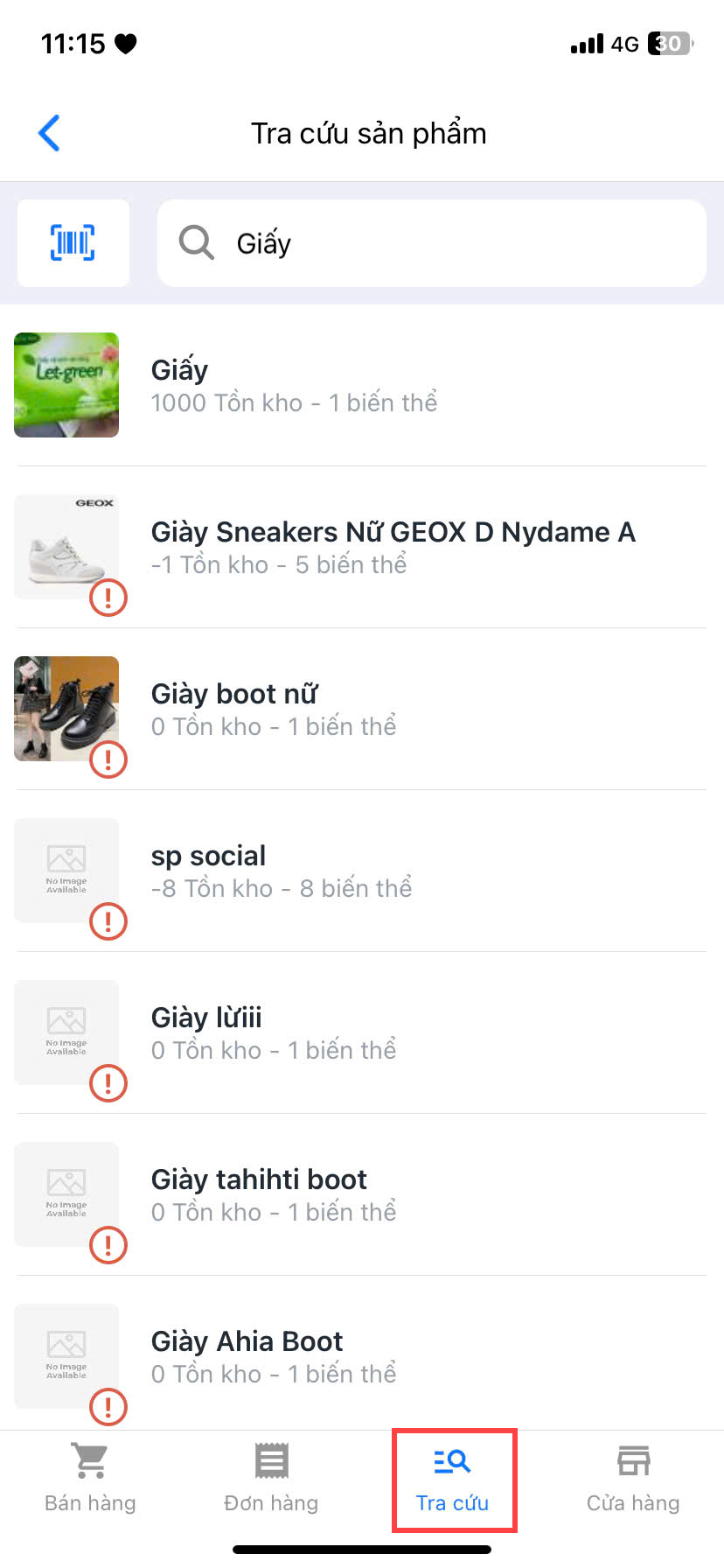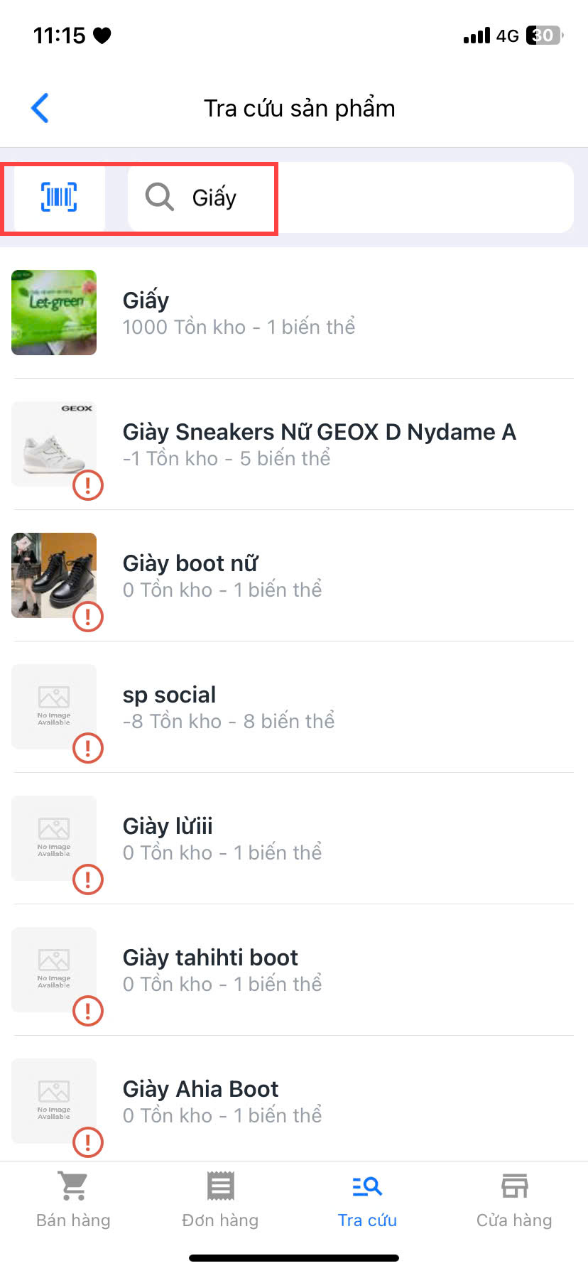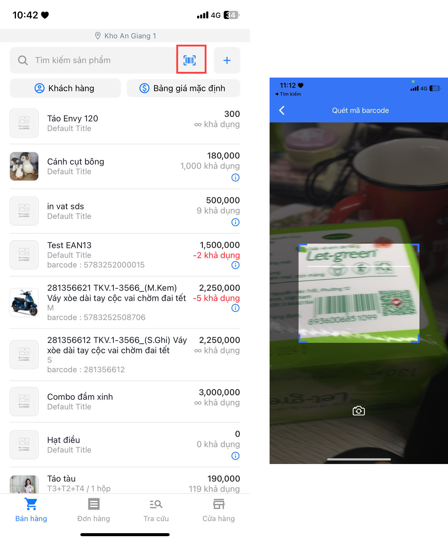 - Bạn có thể tra cứu sản phẩm bằng cách quét mã barcode sản phẩm hoặc tìm sản phẩm theo tên, SKU, barcode