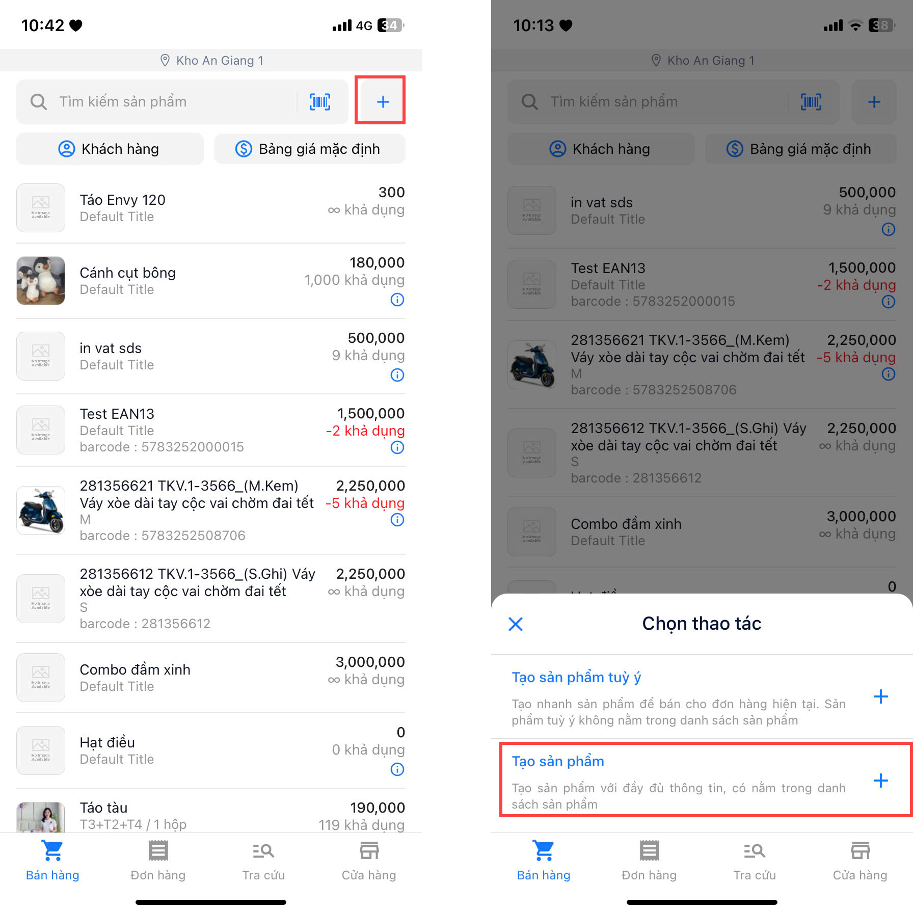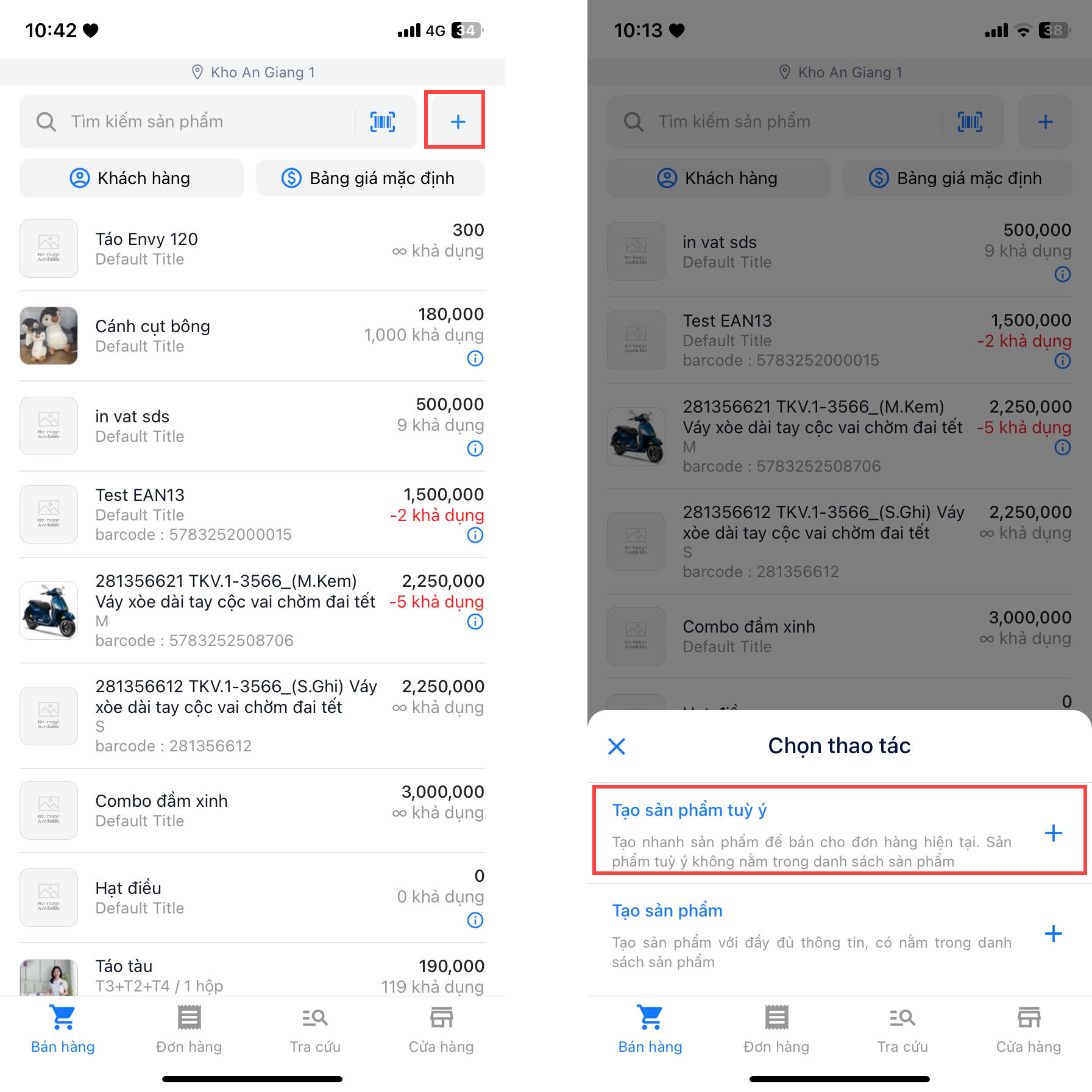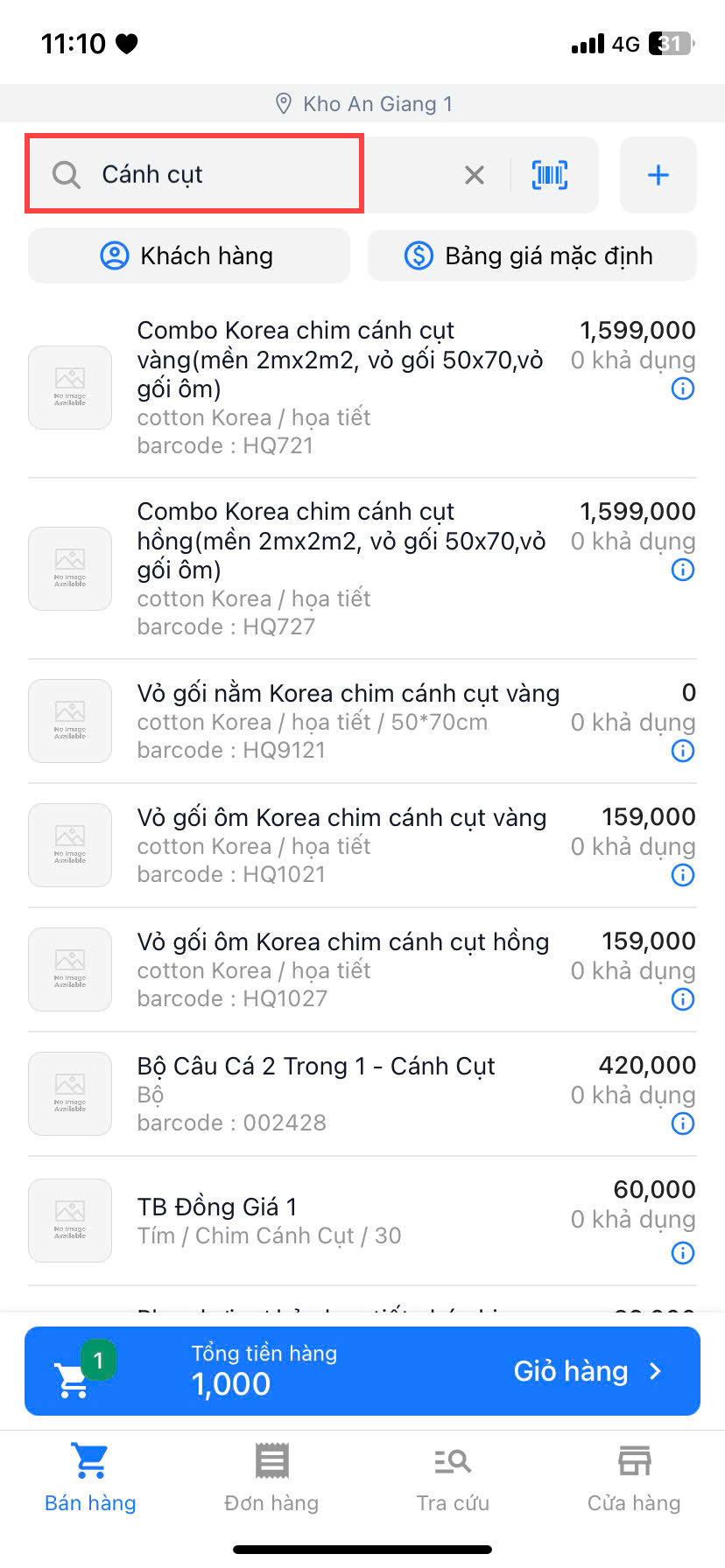 - Bạn có thể tra cứu sản phẩm bằng cách quét mã barcode sản phẩm hoặc tìm sản phẩm theo tên, SKU, barcode
