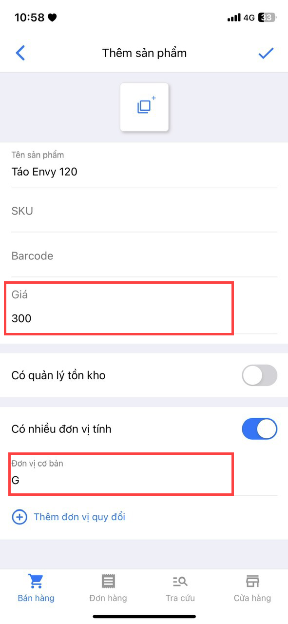 - Thêm đơn vị cơ bản (đơn vị cơ bản là đơn vị nhỏ nhất của sản phẩm như gram, hộp, lon,...)
