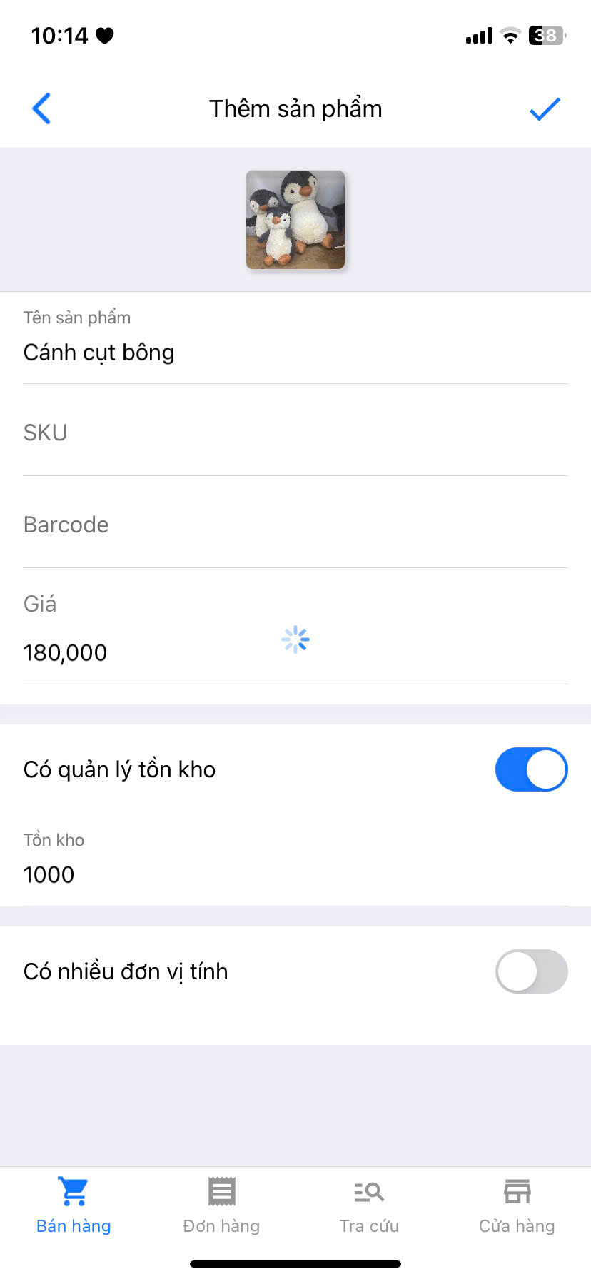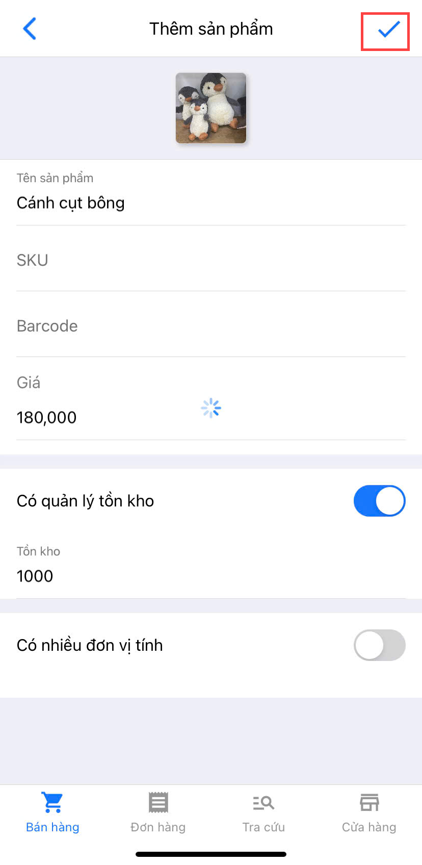 - Sau khi đã hoàn thành việc nhập thông tin, bạn chọn biểu tượng ✅ để hoàn tất việc tạo sản phẩm mới.