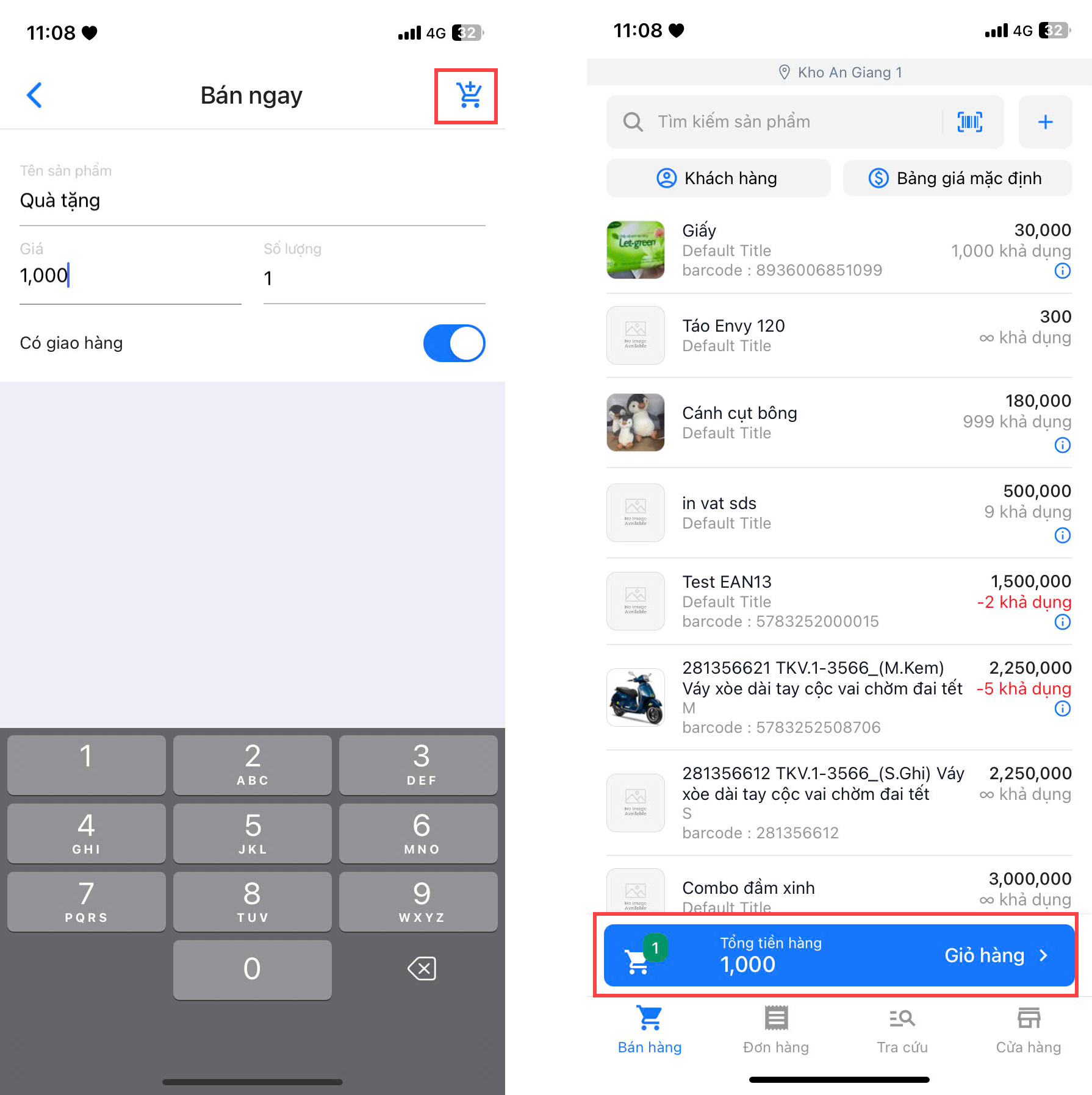 - Ngoài ra, bạn có thể bấm vào biểu tượng quét barcode và thực hiện quét mã để thêm sản phẩm vào đơn.