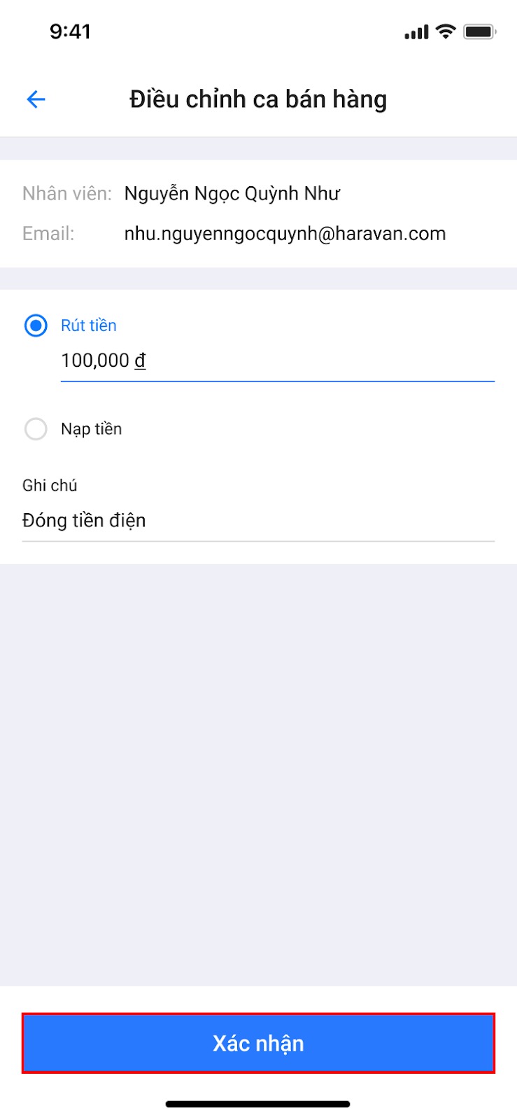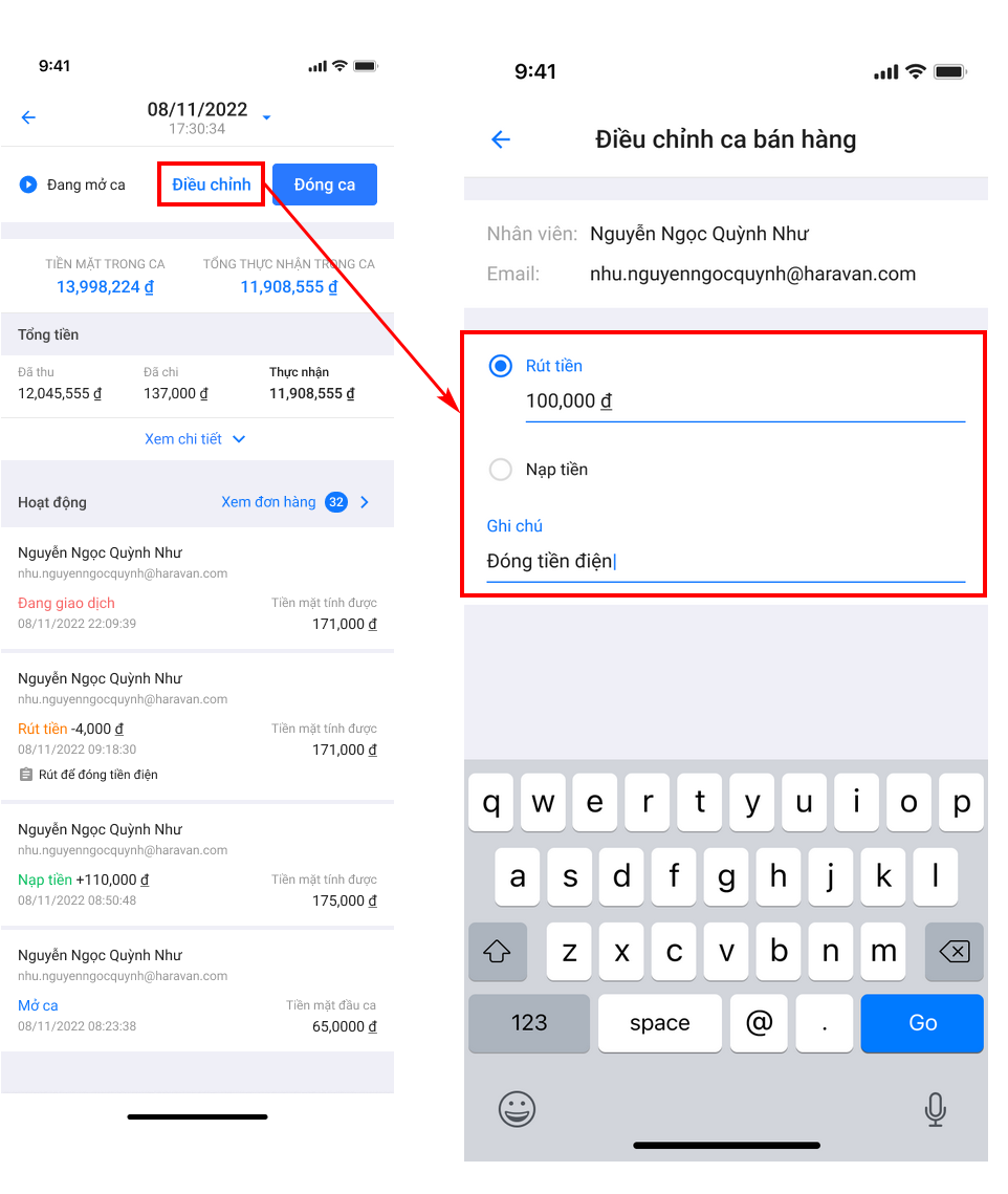 Điều chỉnh số tiền mặt trong ca bán hàng