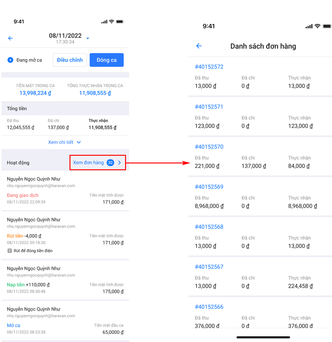 - Chi tiết các giao dịch đã thực hiện trong ca