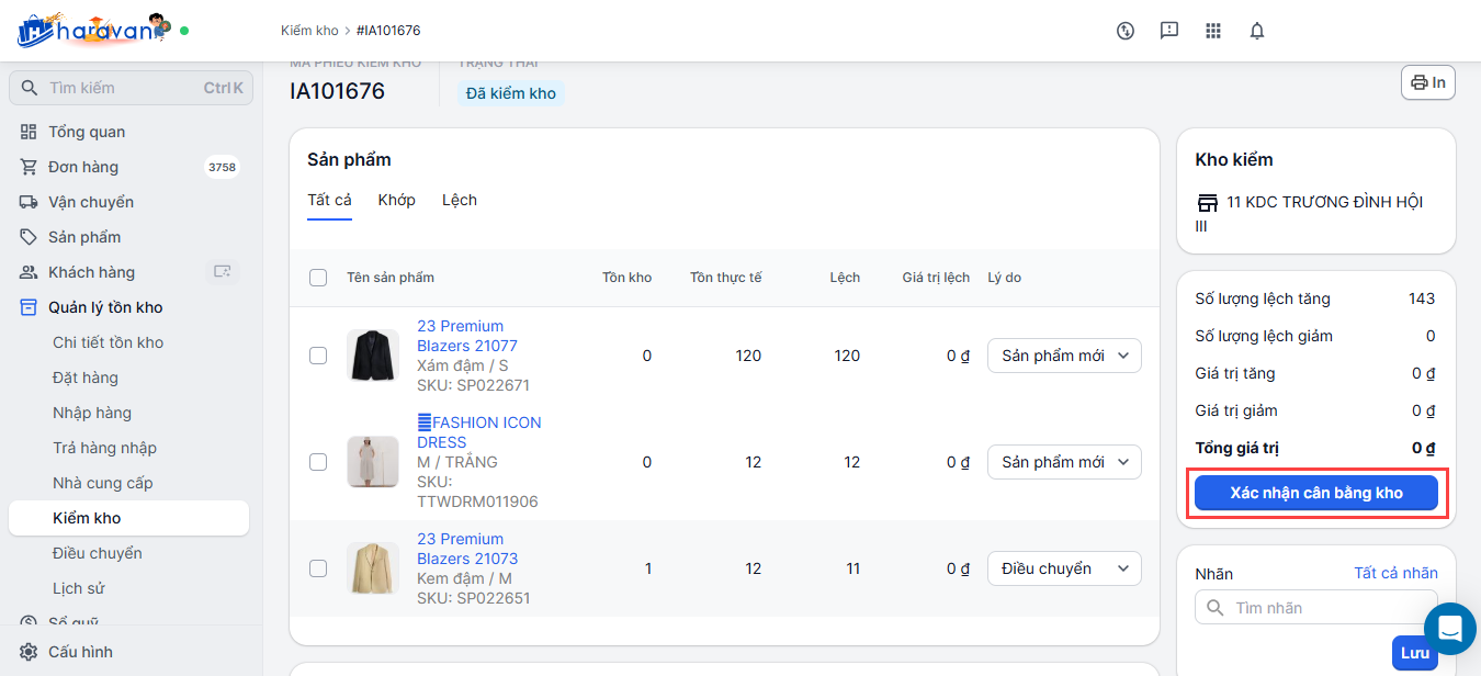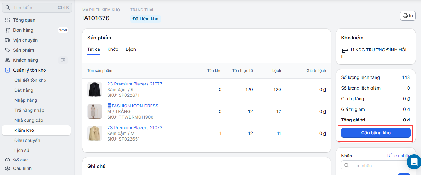 Sau khi xác thực số lượng lệch phát hiện trong quá trình kiểm kho, cần thao tác cân bằng kho để số lượng trên hệ thống bằng với số thực kiểm.