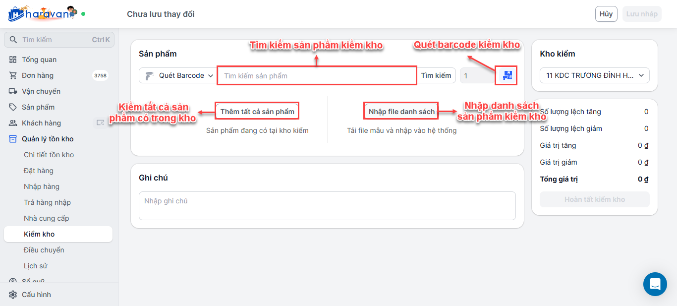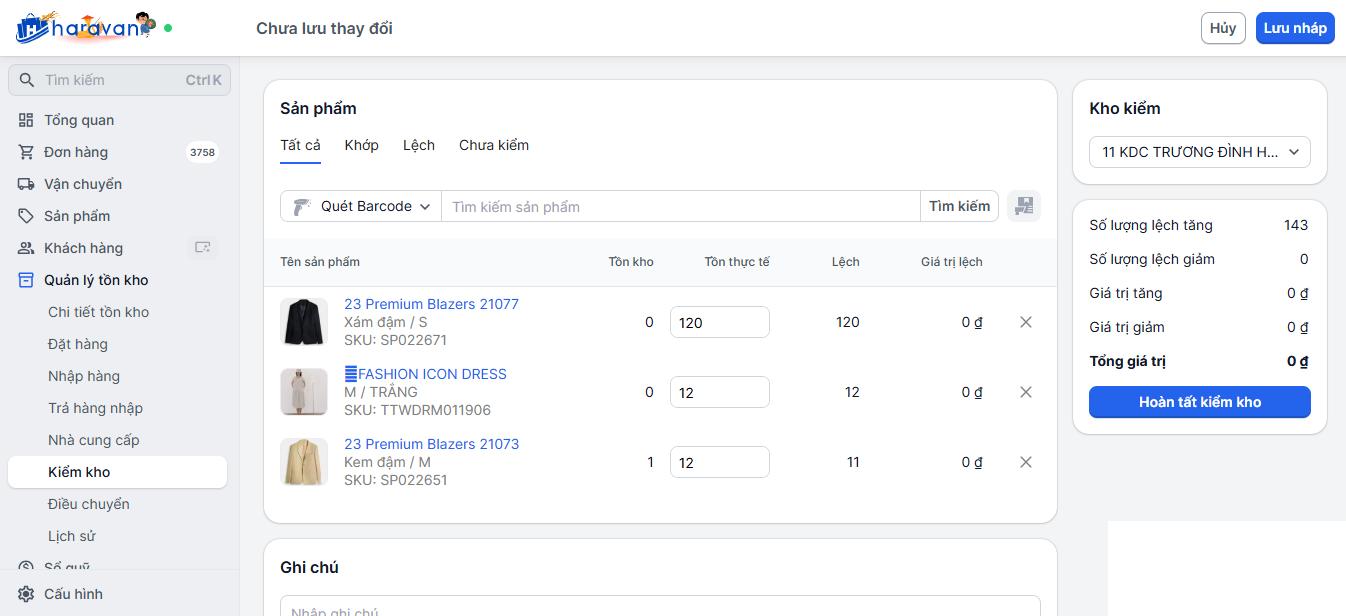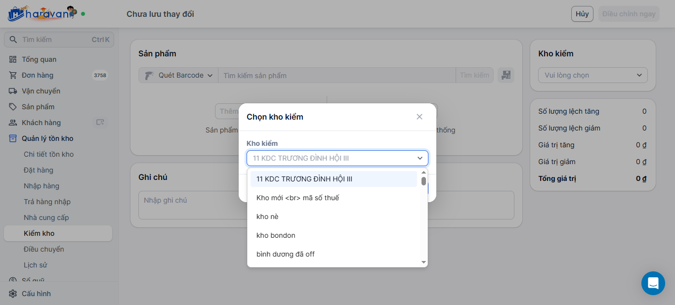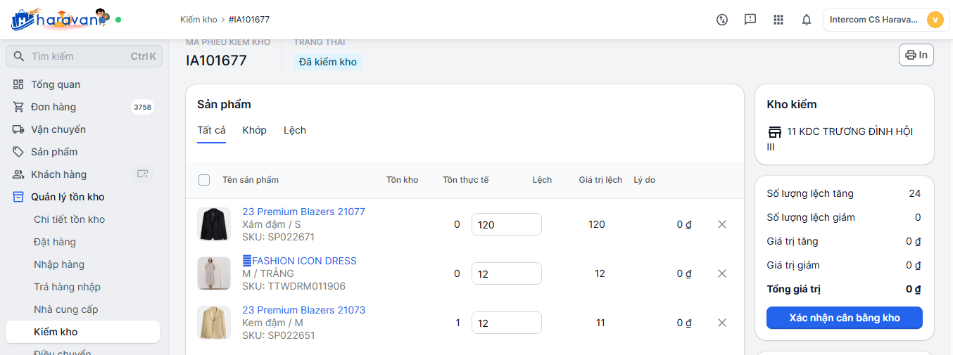 Thao tác kiểm kho nhằm mục đích kiểm tra và xác nhận số lượng hàng tồn thực tế so với số liệu trên hệ thống. Khi tạo phiếu kiểm kho trên Haravan, nhà bán hàng phải trải qua các bước xác nhận cân bằng kho để hệ thống ghi nhận số tồn kho đúng, thay thế số tồn hiện tại của sản phẩm trên hệ thống.
