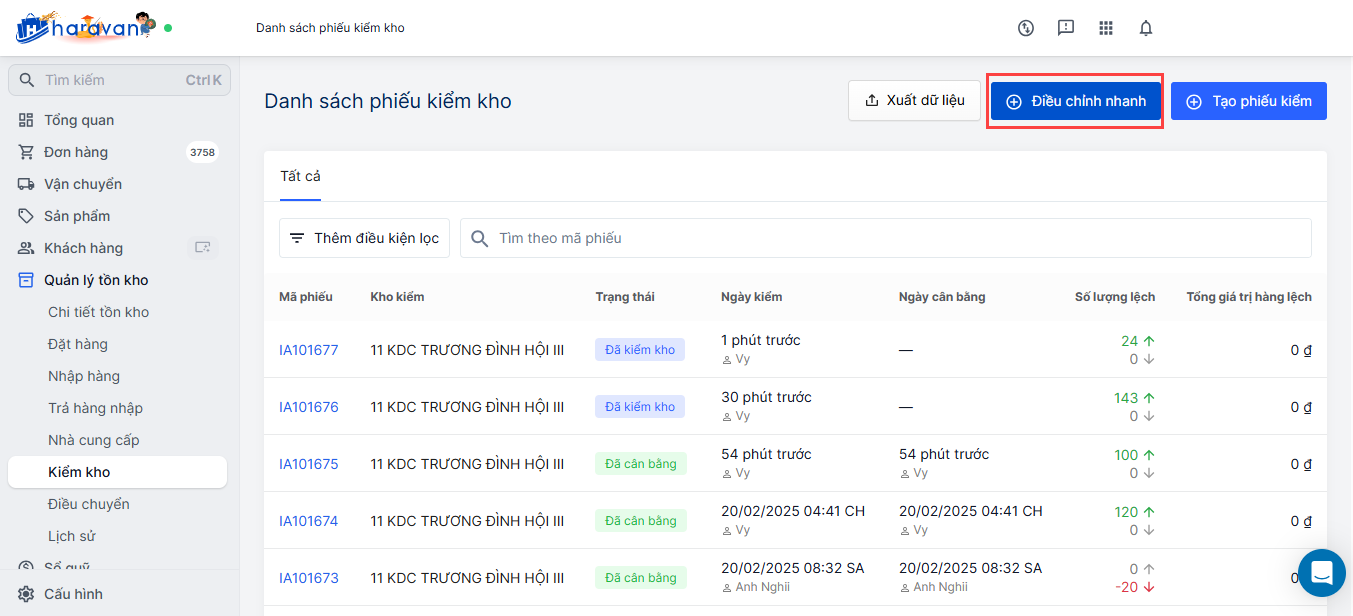 - Tại mục Quản lý tồn kho, chọn Kiểm kho -> Điều chỉnh nhanh