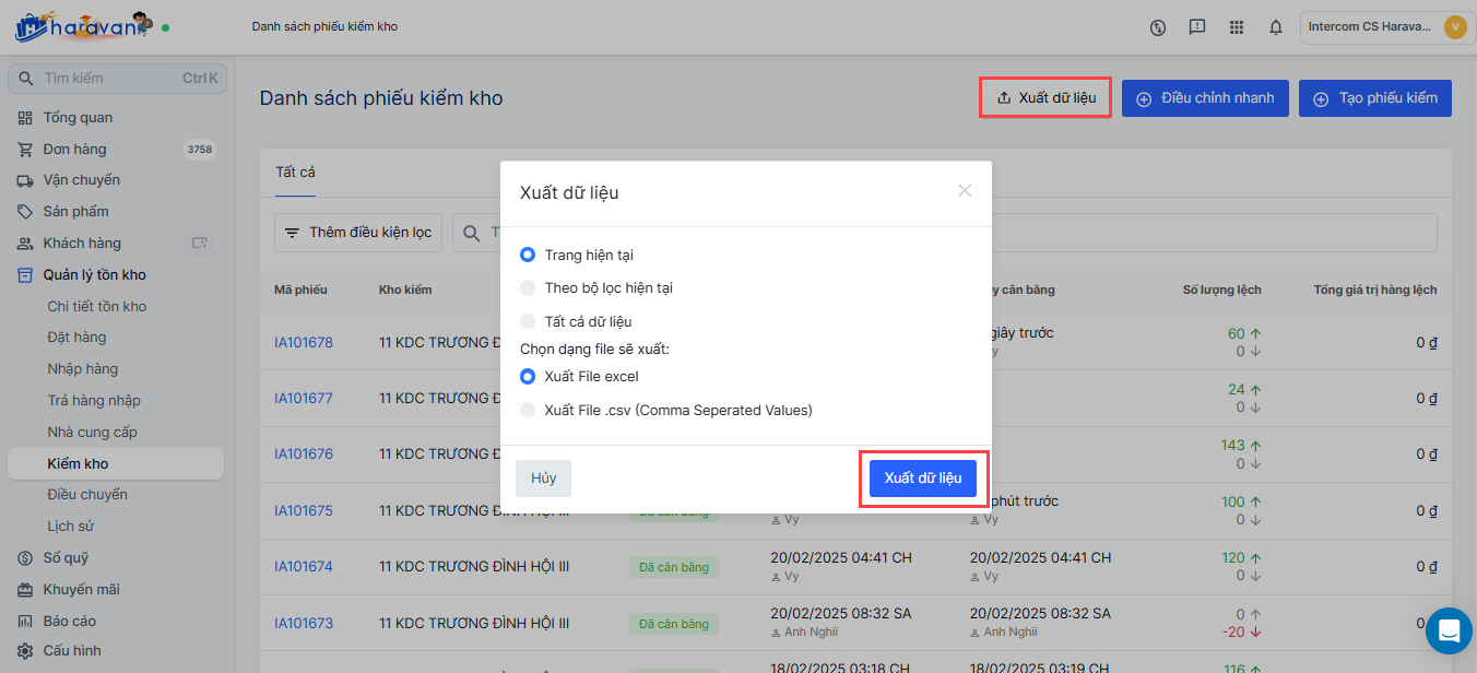 Để thực hiện xuất dữ liệu phiếu kiểm kho, nhà bán hàng thực hiện vào Quản lý tồn kho -> Kiểm kho -> Xuất dữ liệu. Tại đây nhà bán hàng có thể chọn xuất dữ liệu theo trang hiện tại, theo bộ lọc hoặc tất cả dữ liệu. Dữ liệu sẽ được gửi về email để bảo mật thông tin