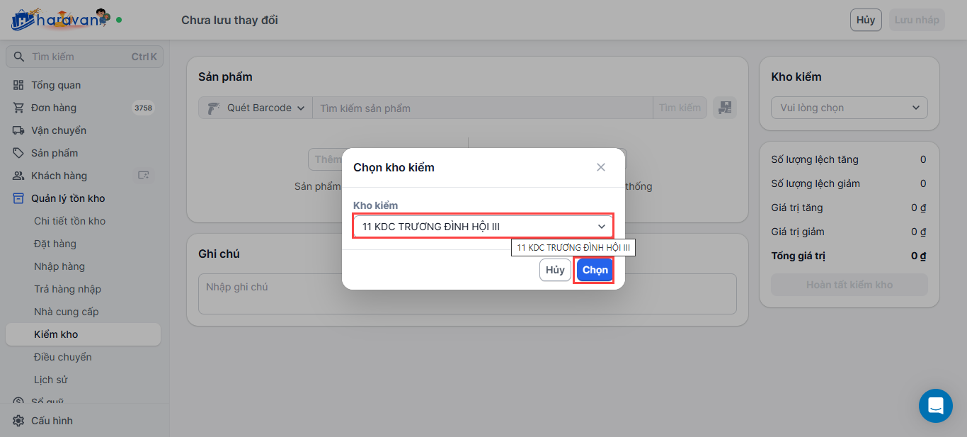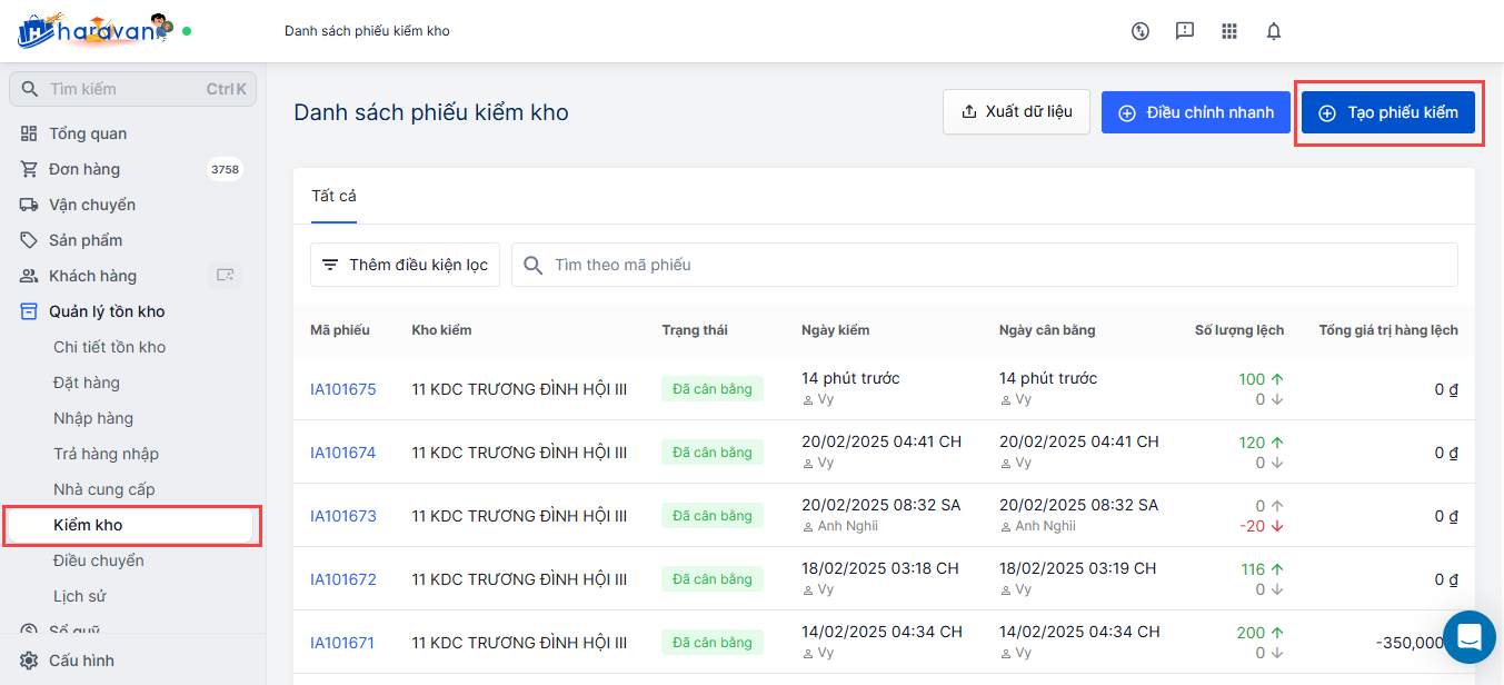 Thao tác kiểm kho nhằm mục đích kiểm tra và xác nhận số lượng hàng tồn thực tế so với số liệu trên hệ thống. Khi tạo phiếu kiểm kho trên Haravan, nhà bán hàng phải trải qua các bước xác nhận cân bằng kho để hệ thống ghi nhận số tồn kho đúng, thay thế số tồn hiện tại của sản phẩm trên hệ thống.