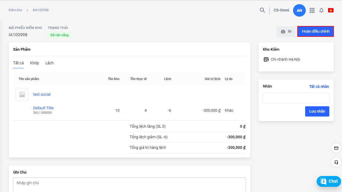 Giá trị lệch của các sản phẩm trong phiếu kiểm kho sẽ tính theo giá vốn hàng loạt tại thời điểm thực hiện hoàn điều chỉnh.