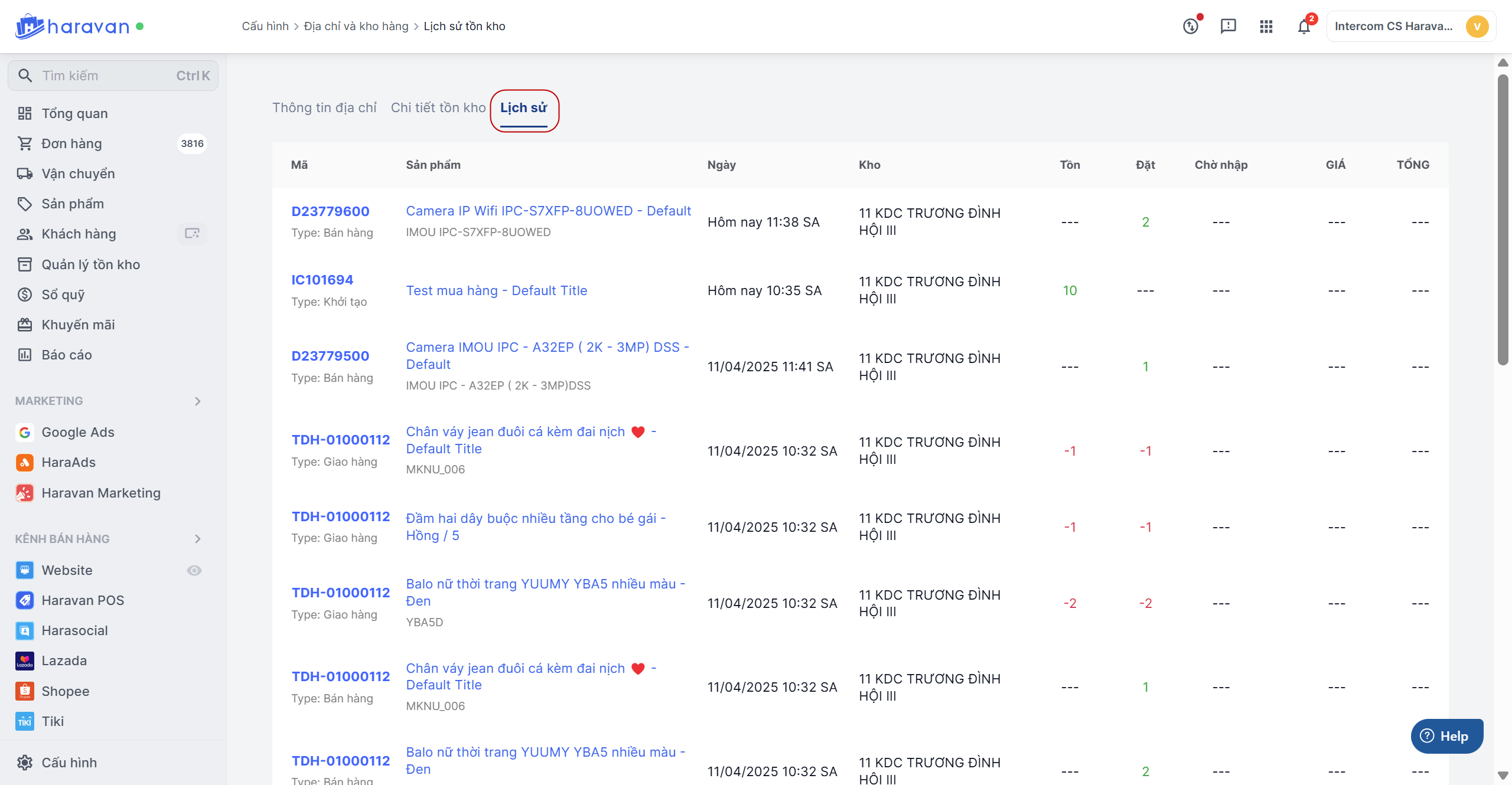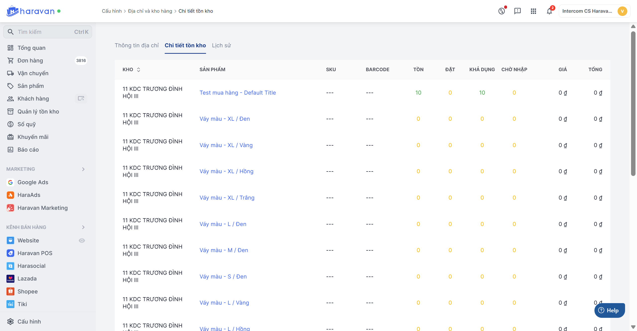 Mỗi một địa chỉ được tạo ra trên Haravan đều là một kho hàng, do đó, chứa các dữ liệu tồn kho tương ứng cho riêng nó. Dữ liệu này bao gồm hai loại thông tin: Chi tiết tồn kho và **Lịch sử (**tương tự như Chi tiết tồn kho và Lịch sử trên phần Quản lý tồn kho của trang Haravan)