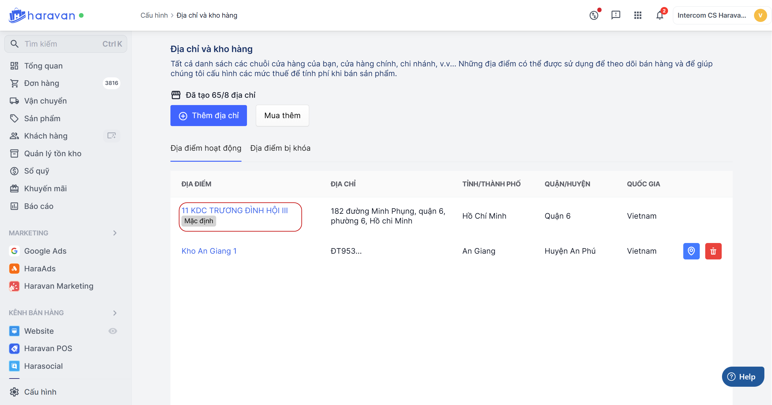 Để xem dữ liệu tài khoản của địa chỉ, Nhà bán hàng vào Trang Haravan > Cấu hình > Địa chỉ > nhấp chọn địa chỉ cần xem chi tiết tồn/lịch sử