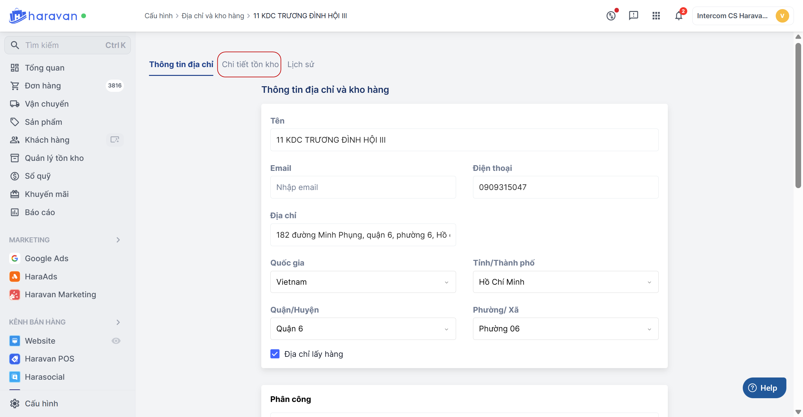 Để xem chi tiết tồn kho cho một địa chỉ, từ Trang Haravan > Nhà bán hàng vào Cấu hình > Địa chỉ > nhấp chọn địa chỉ > chọn thẻ Chi tiết tồn kho.