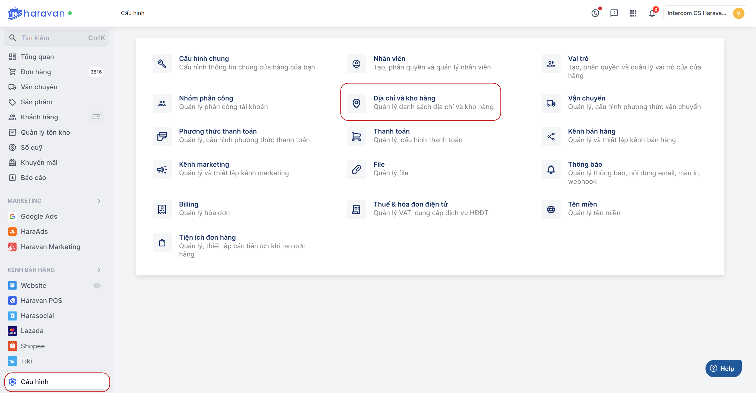 Để xem dữ liệu tài khoản của địa chỉ, Nhà bán hàng vào Trang Haravan > Cấu hình > Địa chỉ > nhấp chọn địa chỉ cần xem chi tiết tồn/lịch sử