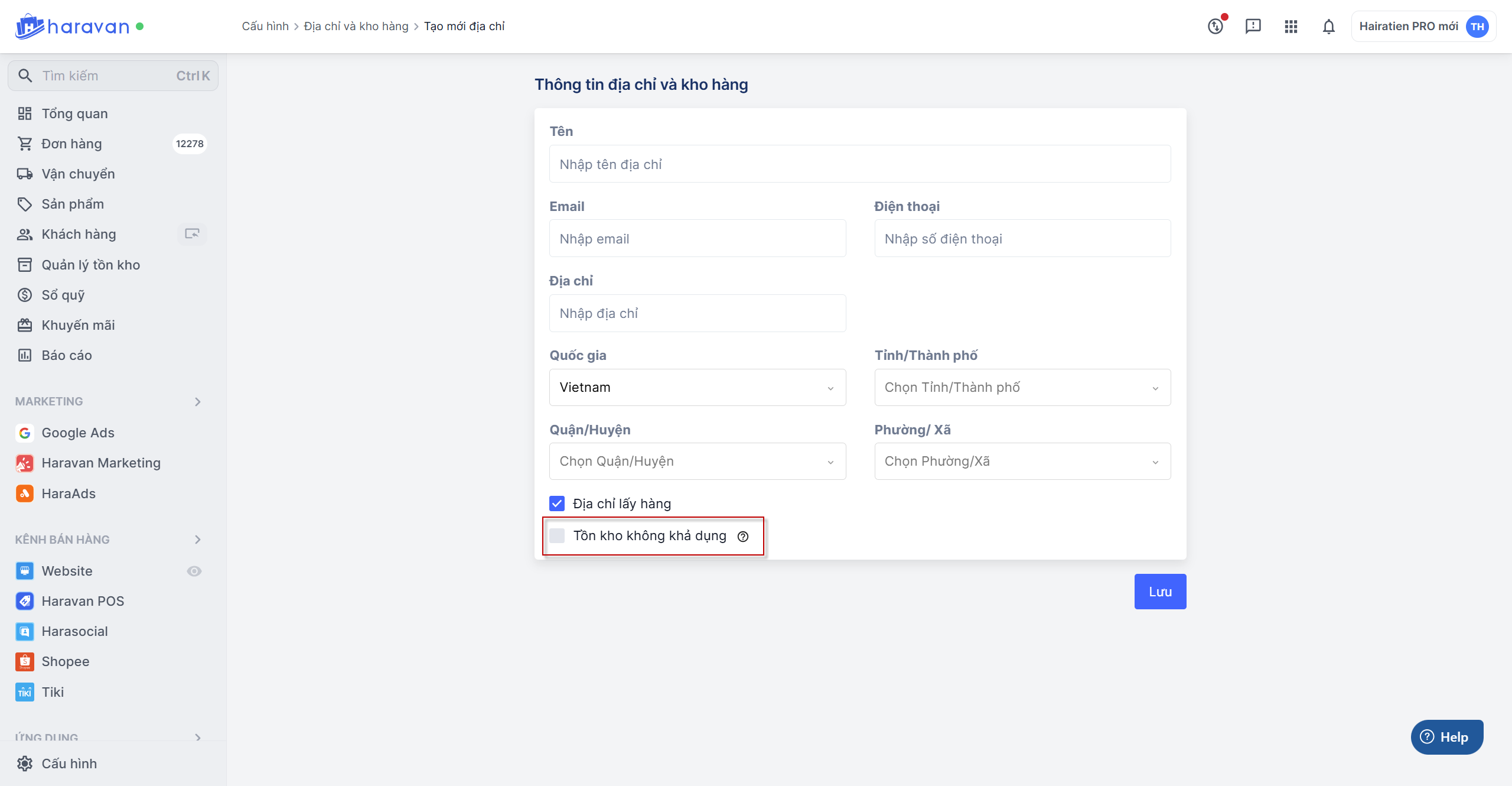- Haravan không giới hạn số lượng kho hàng không khả dụng.
