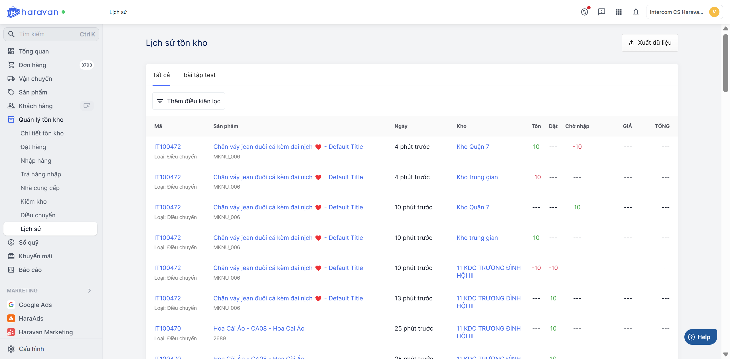 1. Trong giao diện admin Haravan, chọn Quản lý tồn kho > Chọn Lịch sử