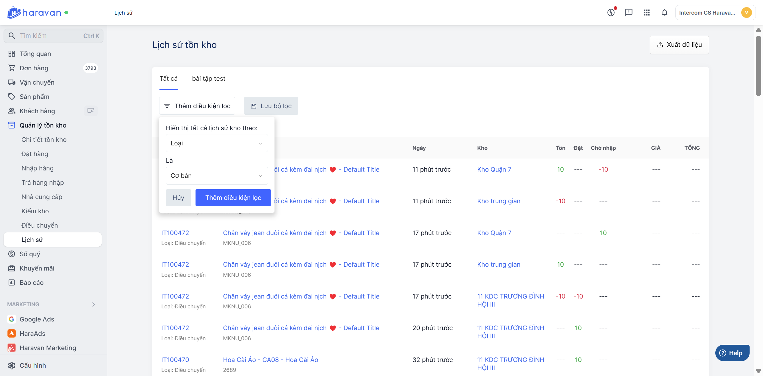 Trang Lịch sử ghi nhận tất cả lịch sử quản lý tồn kho của admin Haravan, bao gồm 8 loại nghiệp vụ: